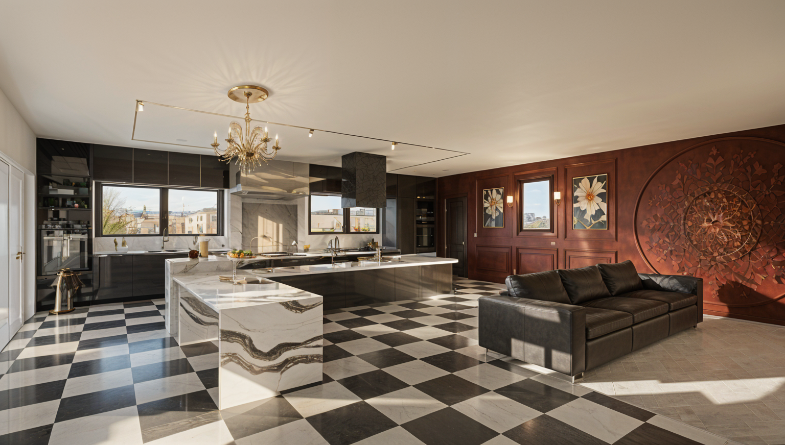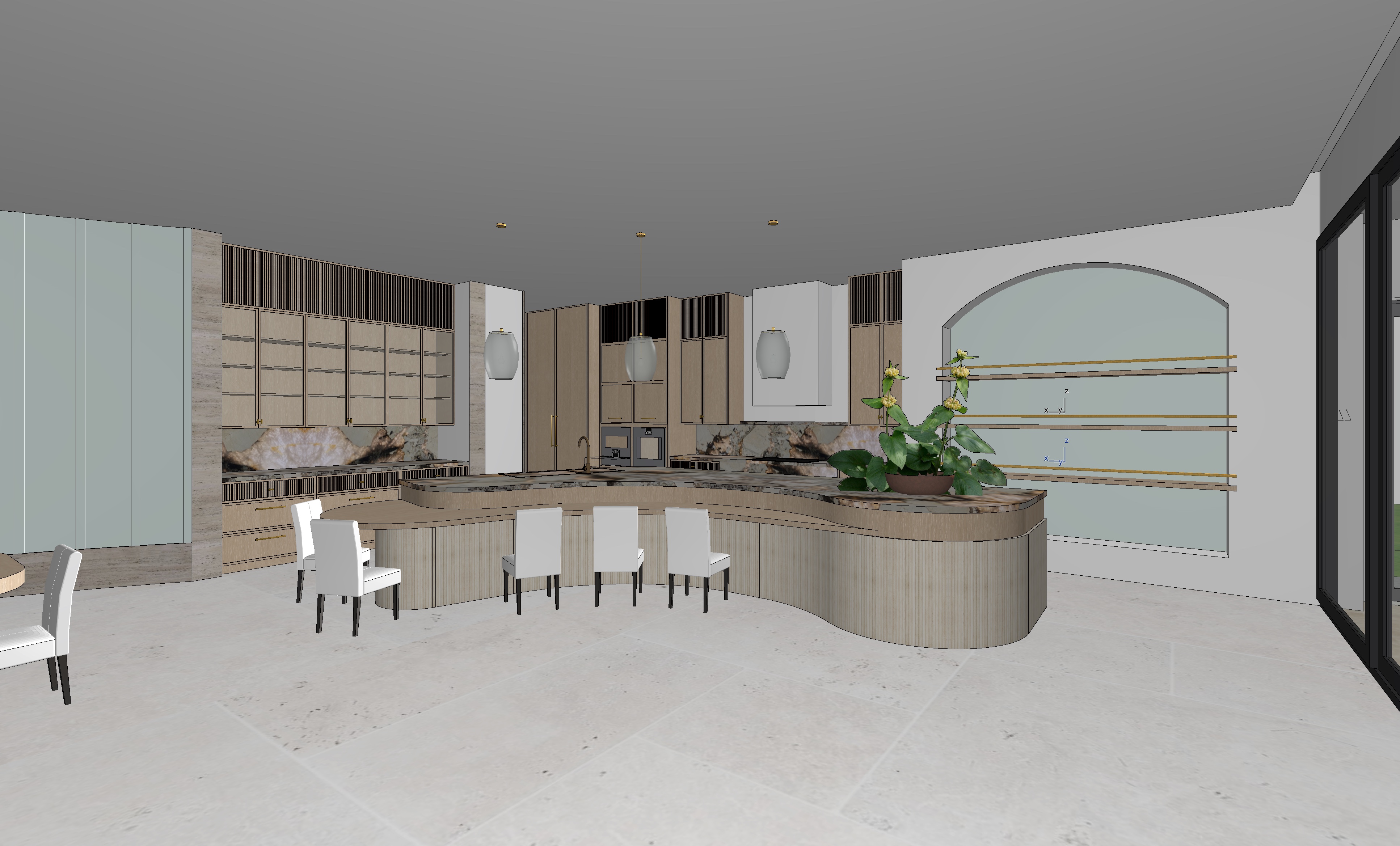 generate a high resolution photorealistic rendering of a luxury kitchen interior based on the provided archicad screenshot preserve all existing textures finishes and materials as shown in the model emphasize realistic lighting with natural sunlight entering through windows soft shadows and reflections on glossy surfaces capture fine details such as wood grain marble countertops metallic fixtures and subtle surface imperfections ensure the perspective and proportions match the original archicad layout creating a visually immersive and lifelike representation of the space