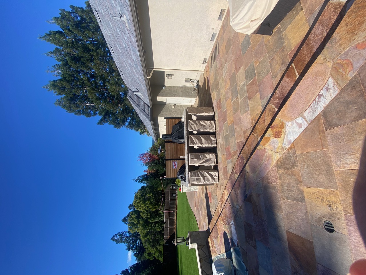 create a covered loggia in front of the house that is not connected to the main roof but stands independent of the existing structure the covered loggia should have stucco over the columns and be made of 8x8 posts place skylights in the roof to show the light coming into the space below the roof should be flat the flat roof should have a ceiling of 10 0