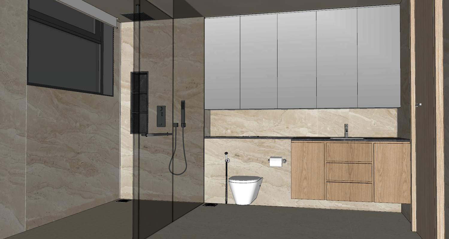 use the same material same colour same mood and make it realistic and detailed the top cabinet is mirro and make the stone more yellowish