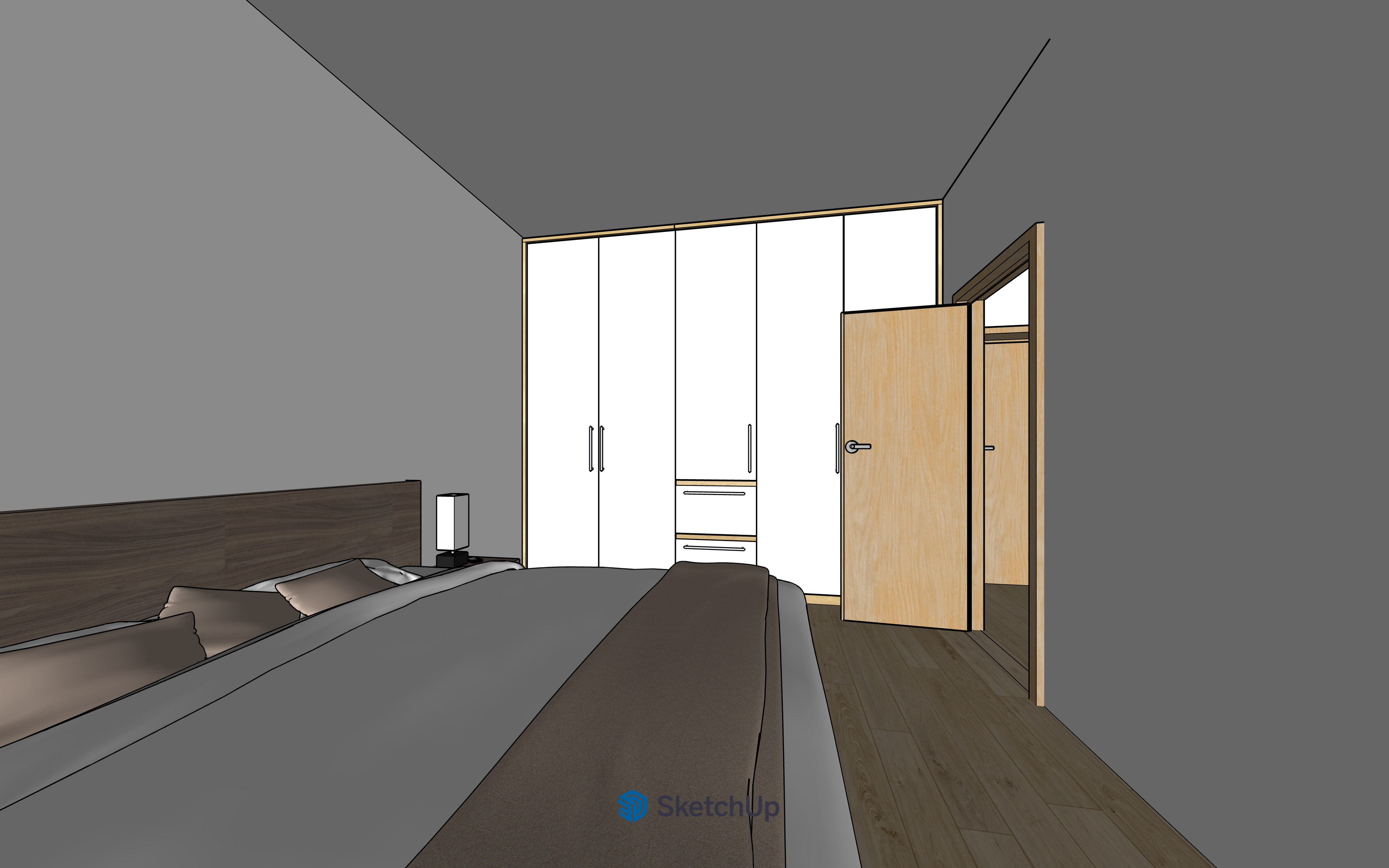 interior shot a cozy modern living and dining area with a minimalist design the walls are painted in a soft light gray for a soothing ambiance the ceiling is a medium gray complementing the space the flooring features a warm natural wood texture the kitchen cabinets are a sleek white with subtle metallic handles and a light wood backsplash the dining table and chairs have a light oak finish adding warmth the sofa is upholstered in a deep charcoal gray providing contrast bookshelves and the tv stand are crafted in a natural wood grain large windows allow natural light to brighten the room enhancing the inviting atmosphere