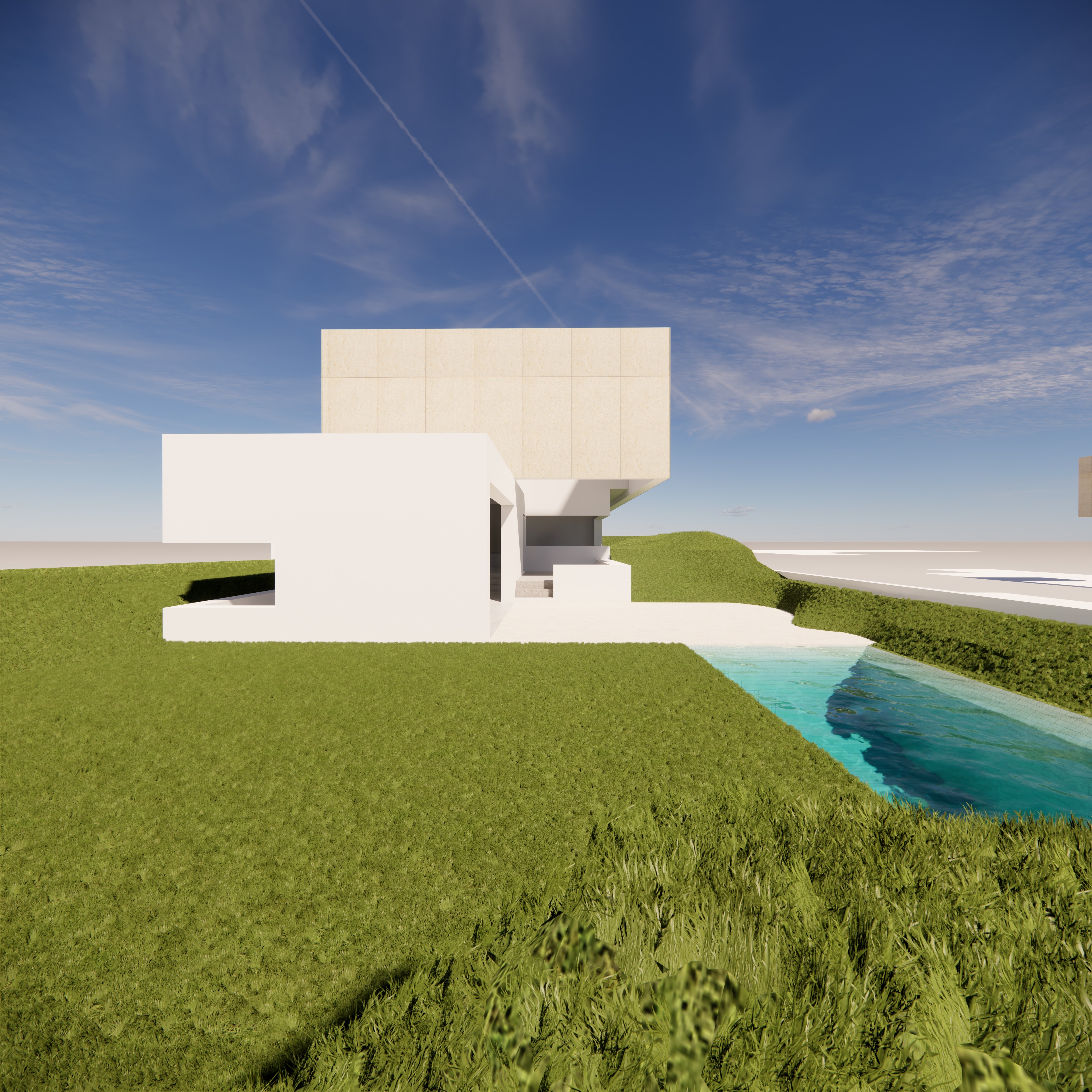 exterior shot create a 3d render from this image should be place like in the middle of the woods in england and must be in rough old red concrete in the white walls and above shoulb be in steel