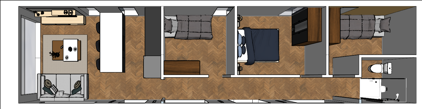 3 bed home with a bathroom kitchen living room aera make it look like a realistic areal floor plan of the layout as in the photo