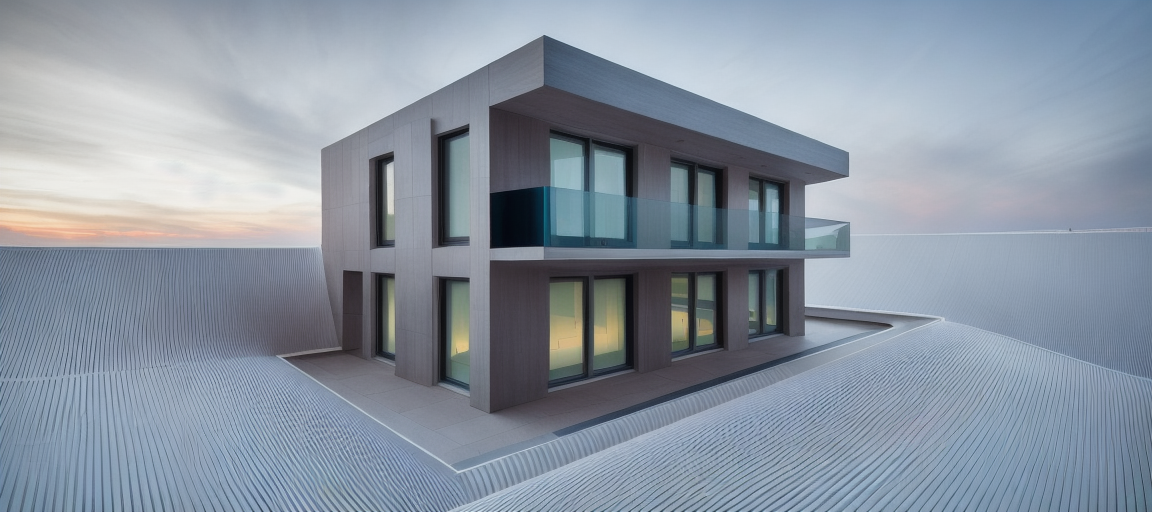 a modern grey house with large windows and a glass balcony set in a lush green field architecture