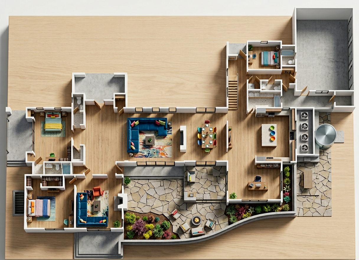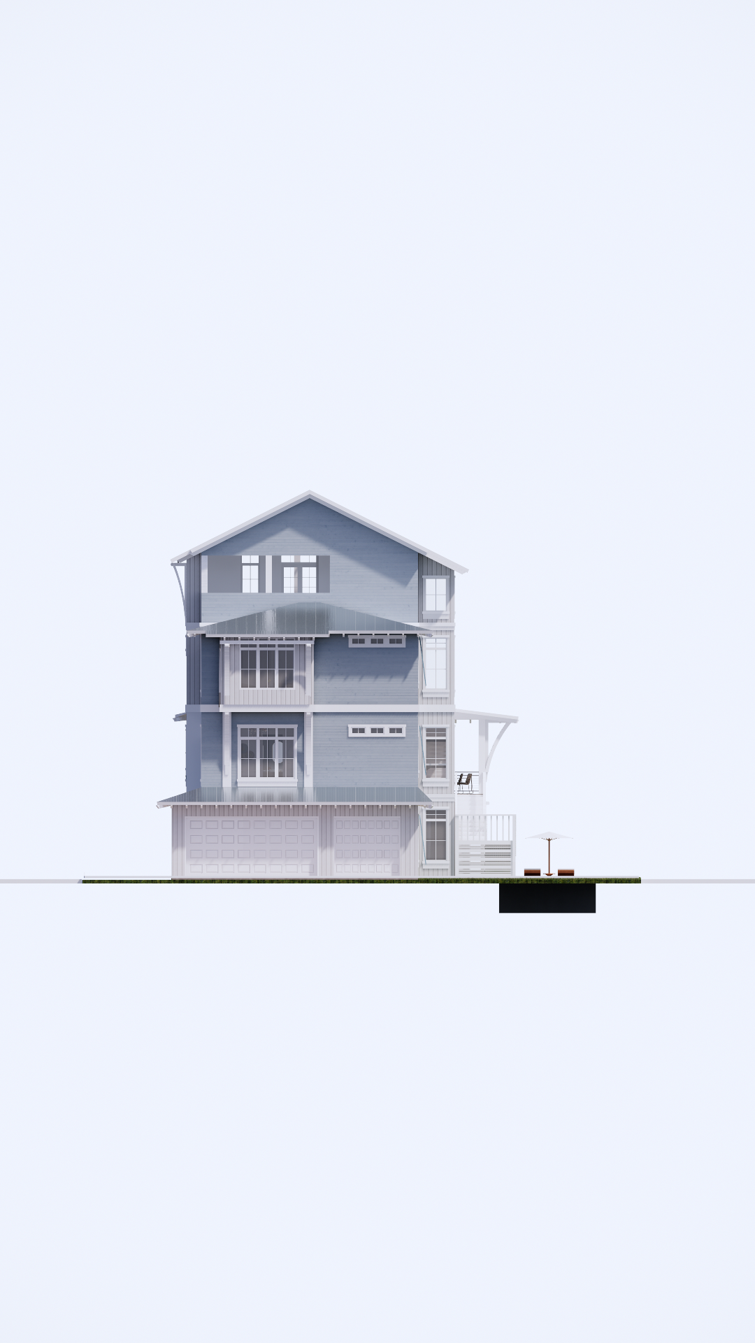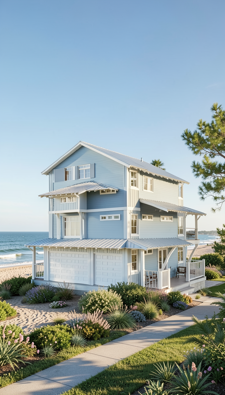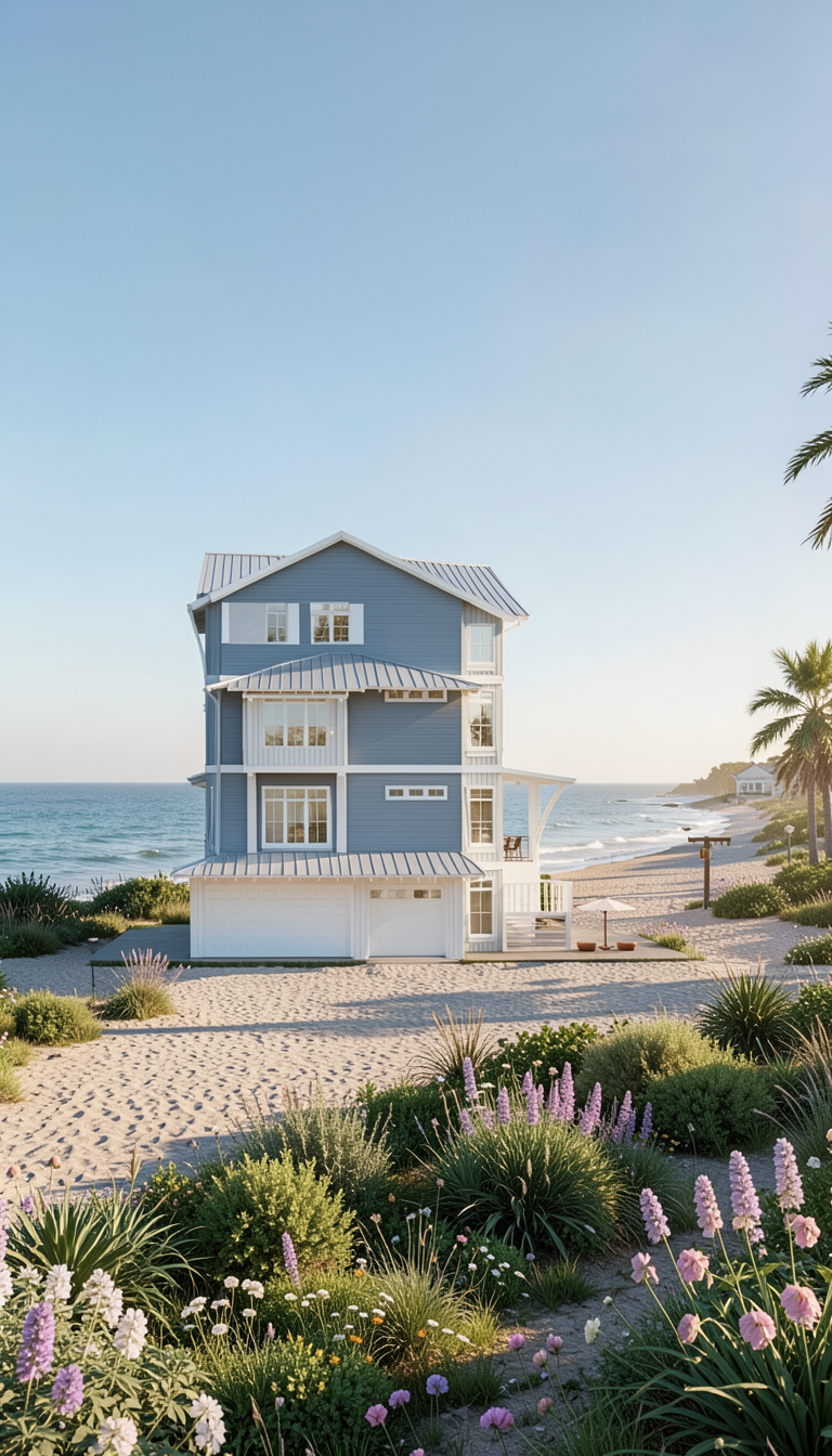 you are a professional image renderer you create the highest grade renderings around and specialize in architectural renderings this is the rear elevation of a beach house create a high resolution photorealistic image of this structure keep the windows as they are where they are keep the doors as they are where they are keep the main structure as it is where it is keep the roofline as it is where is it do not add anything to the structure that i have not asked for the roof is standing seam metal galvalume the background will be a coastal shoreline it should be early afternoon with a bright sunny day clear skies the landscaping should be late summer and should be that of a luxury beach estate