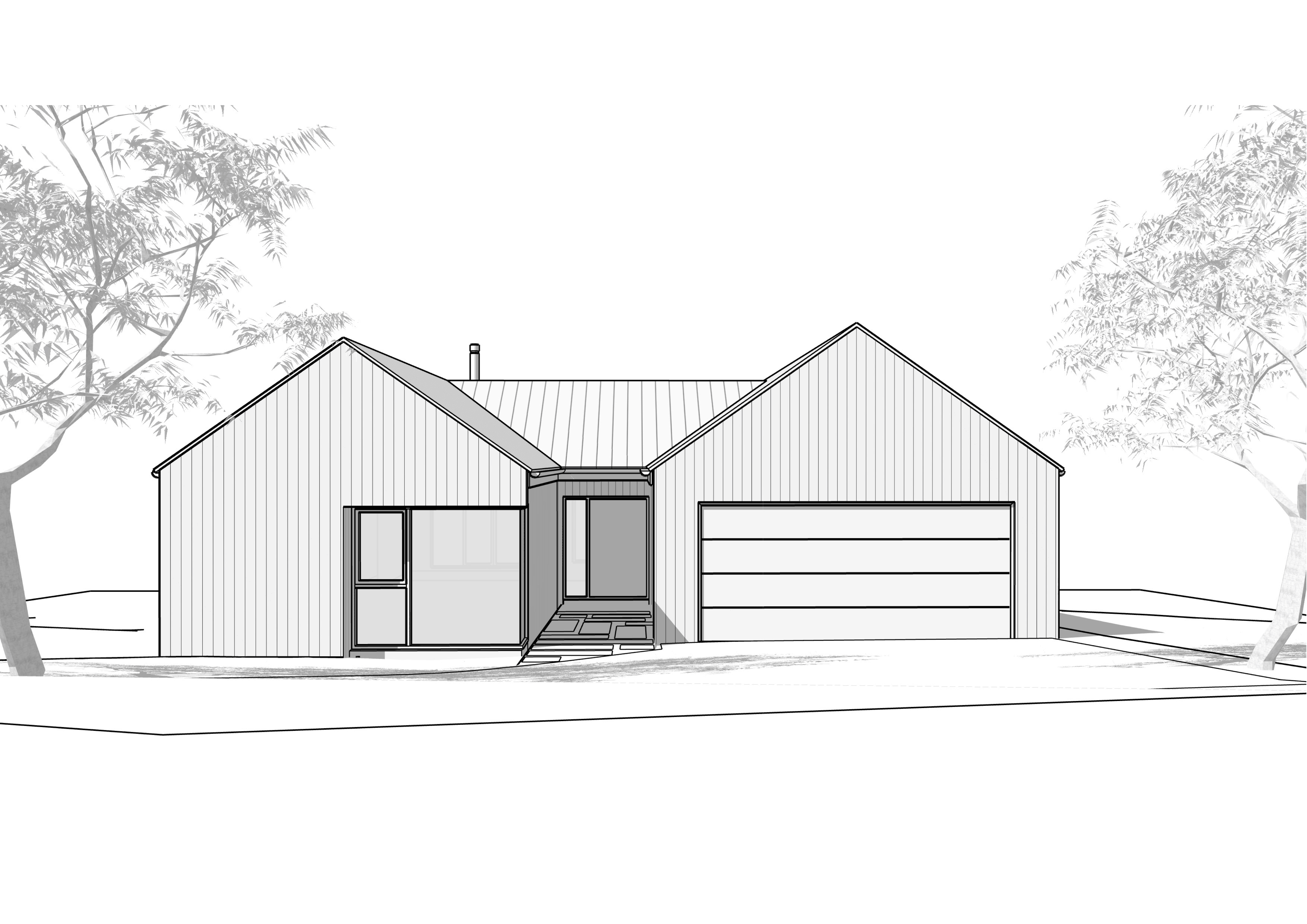 alvar aalto exterior shot render a modern minimalist house with a sleek scandinavian design the facade features a clean white finish with vertical siding the roof is a medium gray metal reflecting a contemporary aesthetic the large glass entryway is bordered by a glossy black frame adding contrast and sophistication the garage door complements the roof with its smooth gray surface surround the house with a soft green lawn and scattered evergreen trees set against a clear light blue sky the atmosphere is serene and bright embodying a peaceful morning ambiance architecture