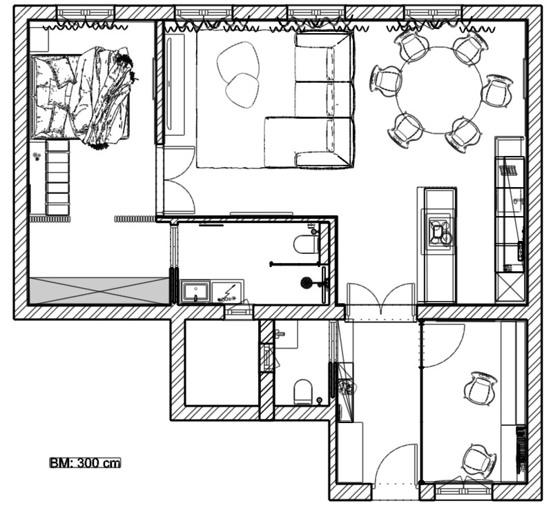 convert this floor plan into a realistic isometric 3d view of a full house show the space from an elevated angle with furniture walls and details visible 3d isometric floor plan visualization of a modern apartment dollhouse view spacious open plan living area with a light grey l shaped sectional sofa and a round wooden dining table with 6 designer chairs modern kitchen featuring a large black marble island and sleek cabinetry cozy bedroom with a queen size bed neutral linens and minimalist wardrobe bathroom with walk in shower and elegant tiling light oak wood flooring throughout white plastered walls high end furniture bright natural daylight soft shadows photorealistic architectural rendering 8k resolution highly detailed textures use the same furniture as shows on the plan do not change the orientation of the floorplan