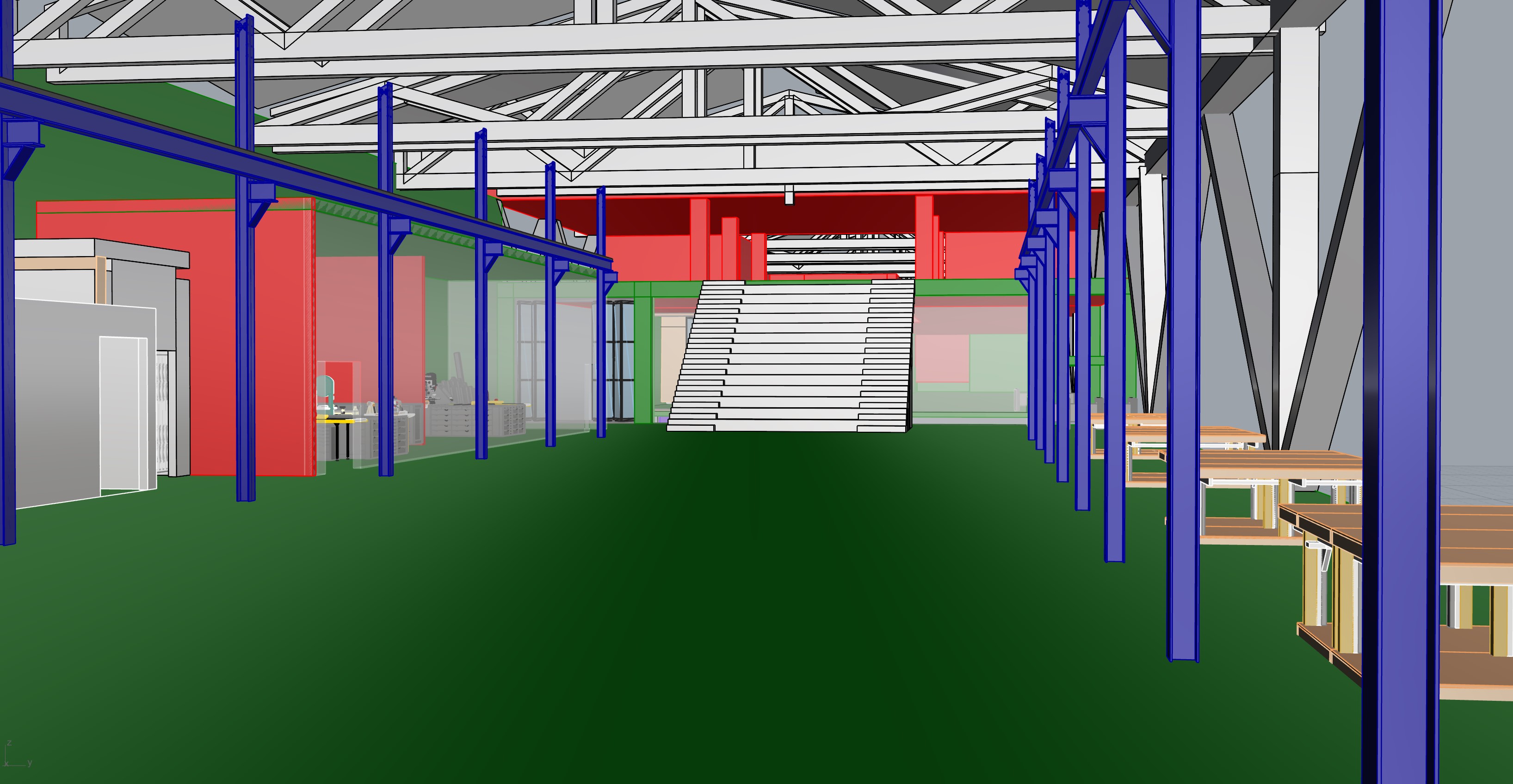 this is a timber based building on the left are wood shops workshops and in the middle is a high bay with a single gantry crane and a timber bleacher staircase on the right is a v shaped timber face with butcher blocks with students working upstairs are classrooms and sit down areas and the roof is being supp orted by a timber truss