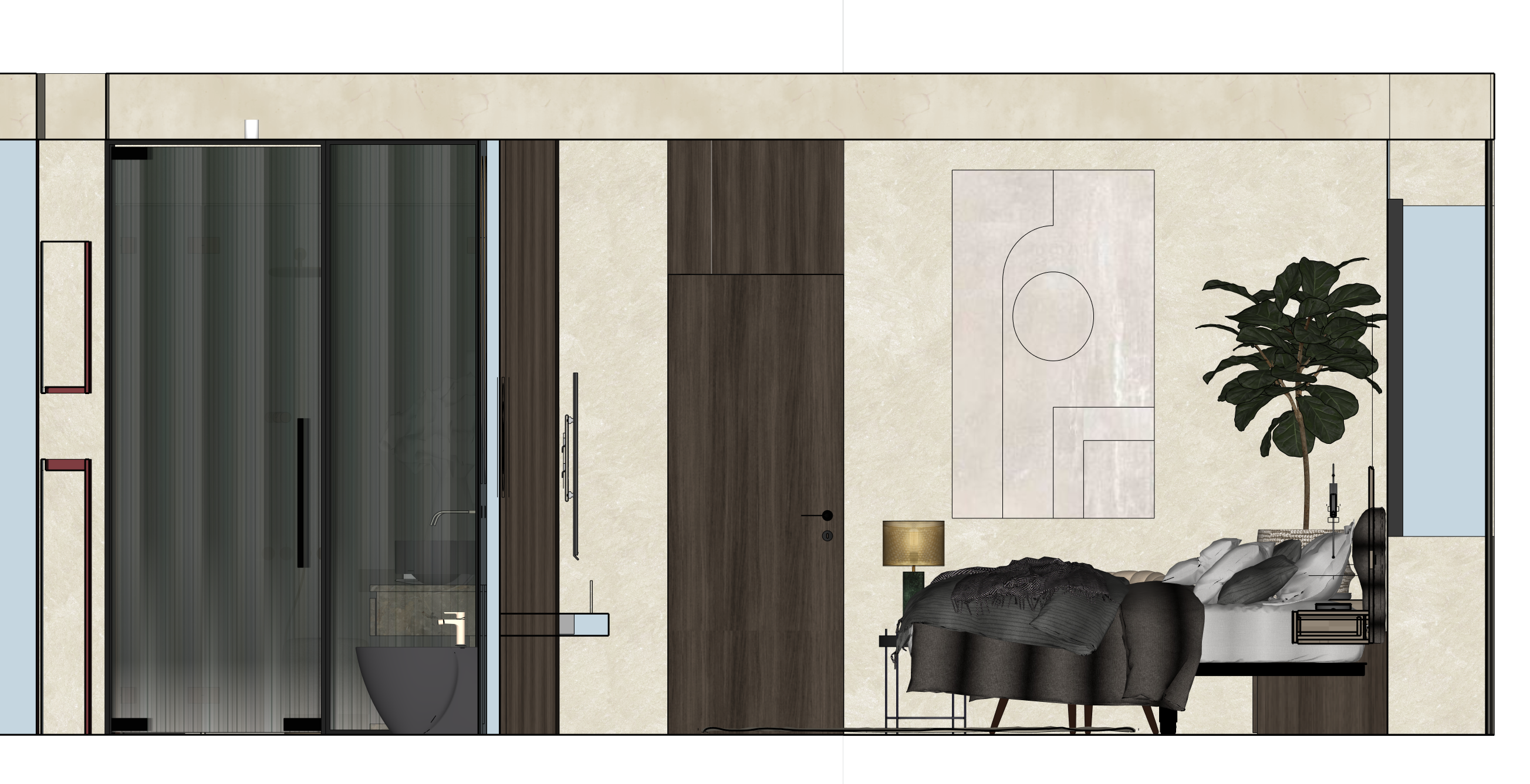 front elevation architectural rendering of a contemporary interior composition including bathroom and bedroom area maintain exact composition proportions alignment and all architectural elements do not modify layout geometry spacing or relationships between elements preserve all existing materials textures colors and finishes exactly as shown beige stone effect wall cladding with subtle natural variation dark wood vertical paneling and flush door with matte finish black metal framed shower enclosure with ribbed frosted glass minimal bathroom fixtures visible through the glass sink and sanitary elements deep burgundy vertical architectural accent on the far left light neutral ceiling band above furniture and decor must remain identical in position scale and style bed with soft upholstered structure and layered bedding in neutral and dark tones textured throw blanket casually placed over the bed bedside table with thin black metal structure table lamp with green base and warm fabric shade turned on minimal wall artwork with geometric pattern above the bed large indoor plant with broad leaves in a textured neutral vase low dark wood cabinet under the plant white background only no environment no exterior context no additional elements apply a refined high end architectural visualization style with a slightly more intimate atmosphere warm soft diffused lighting with a slightly evening mood visible warm glow from the bedside lamp creating a gentle light gradient on the wall deeper shadows to enhance contrast and spatial layering subtle ambient occlusion for depth and realism realistic material rendering matte wood tactile stone surface soft fabric translucent ribbed glass controlled reflections on glass and metal elements enhance the perception of depth between bathroom cooler softer light through glass and bedroom warmer more intimate lighting avoid cold or bluish tones maintain a warm elegant high end mood ultra clean composition sharp details high realism premium architectural visualization quality
