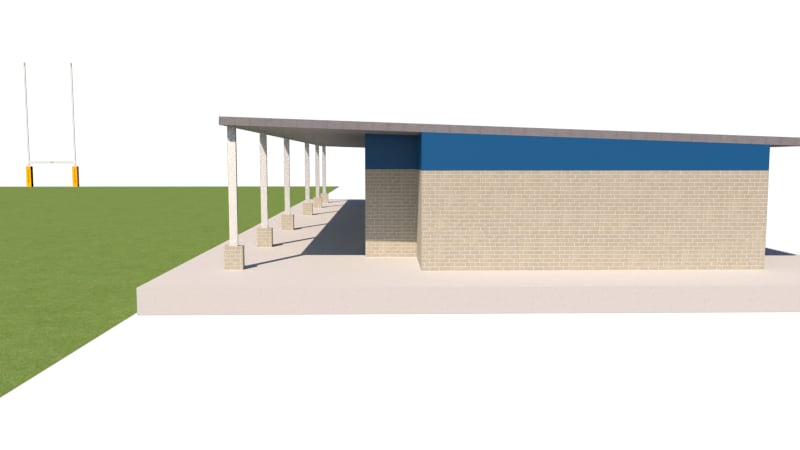do not change geometry add rugby player onto the rugby field in blue uniforms add a few spectators watching the game from the grandstand building