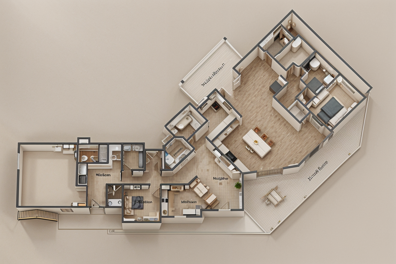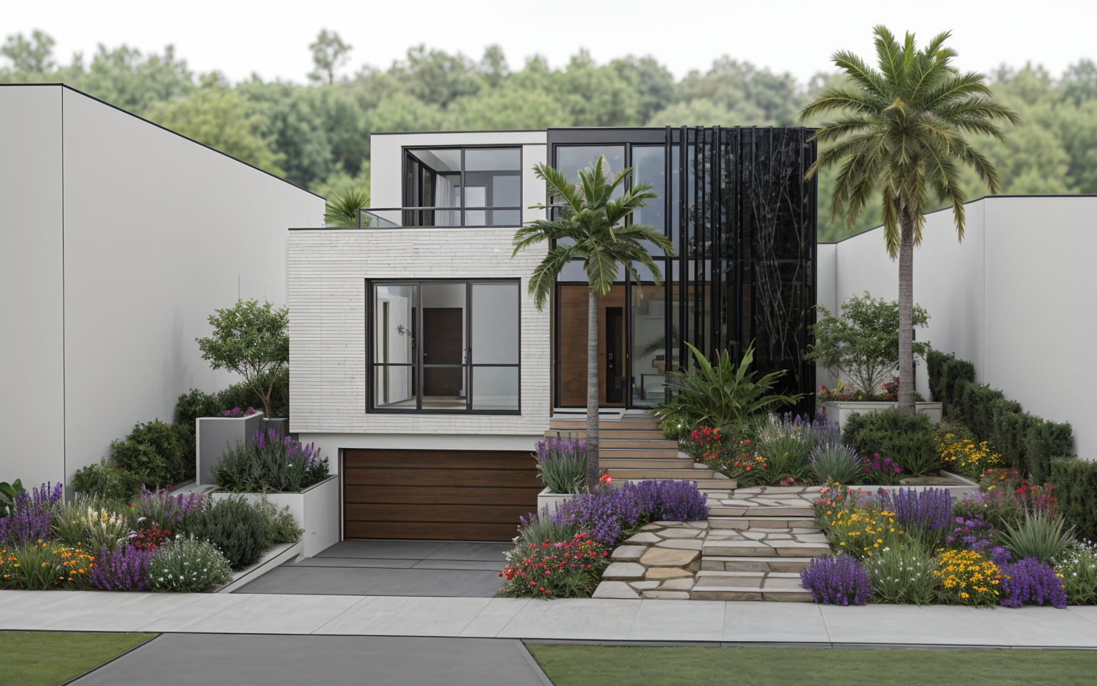 exterior shot stone cladding to front boundary wall and garage cement render to middle portion of house and columns brick finish to upper level bronze trims to balustrades and roof lush garden