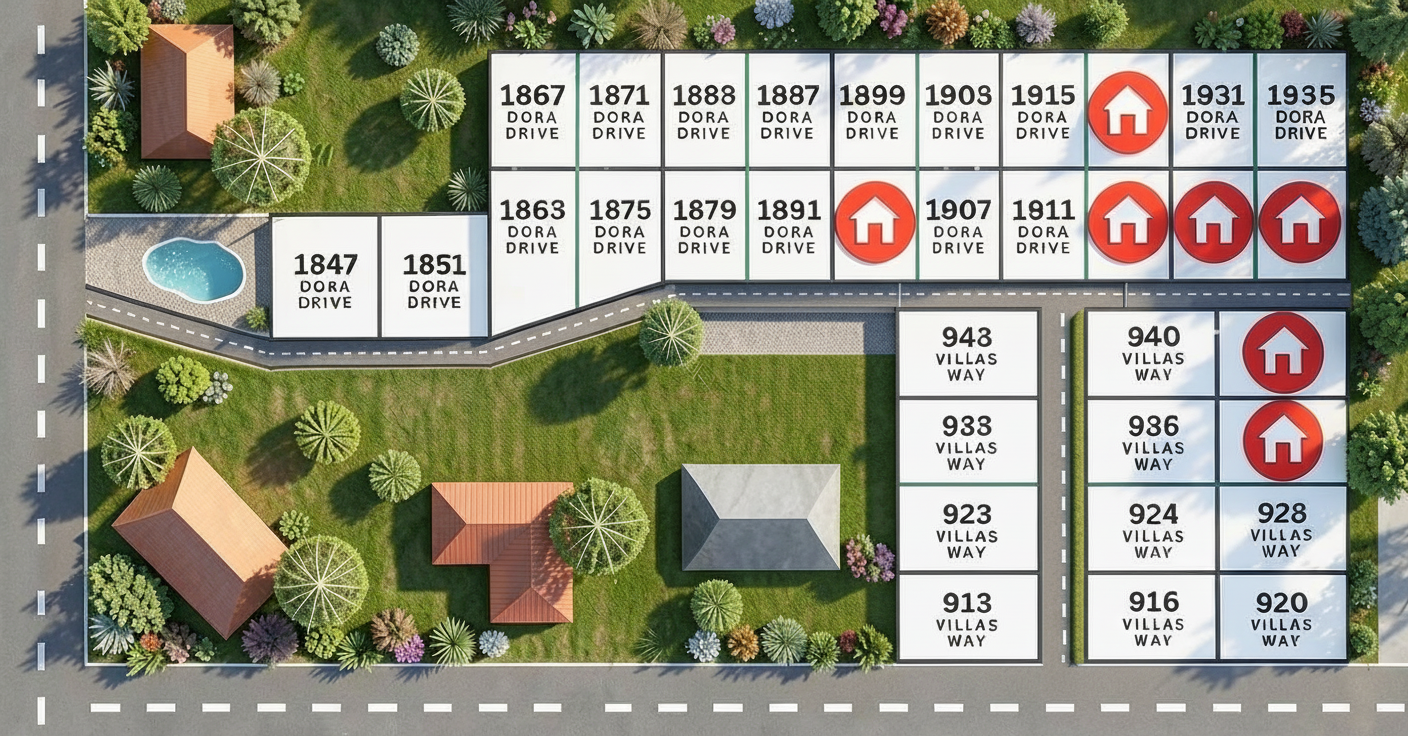 carlo scarpa exterior shot do not change this subdivision layout or the name and numbers keep the red house icons just as they are architecture