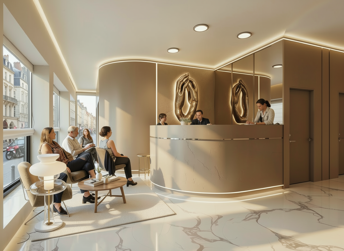 add more soft light one receptionist two people waiting for massage put revolu n street in prague behind windows left