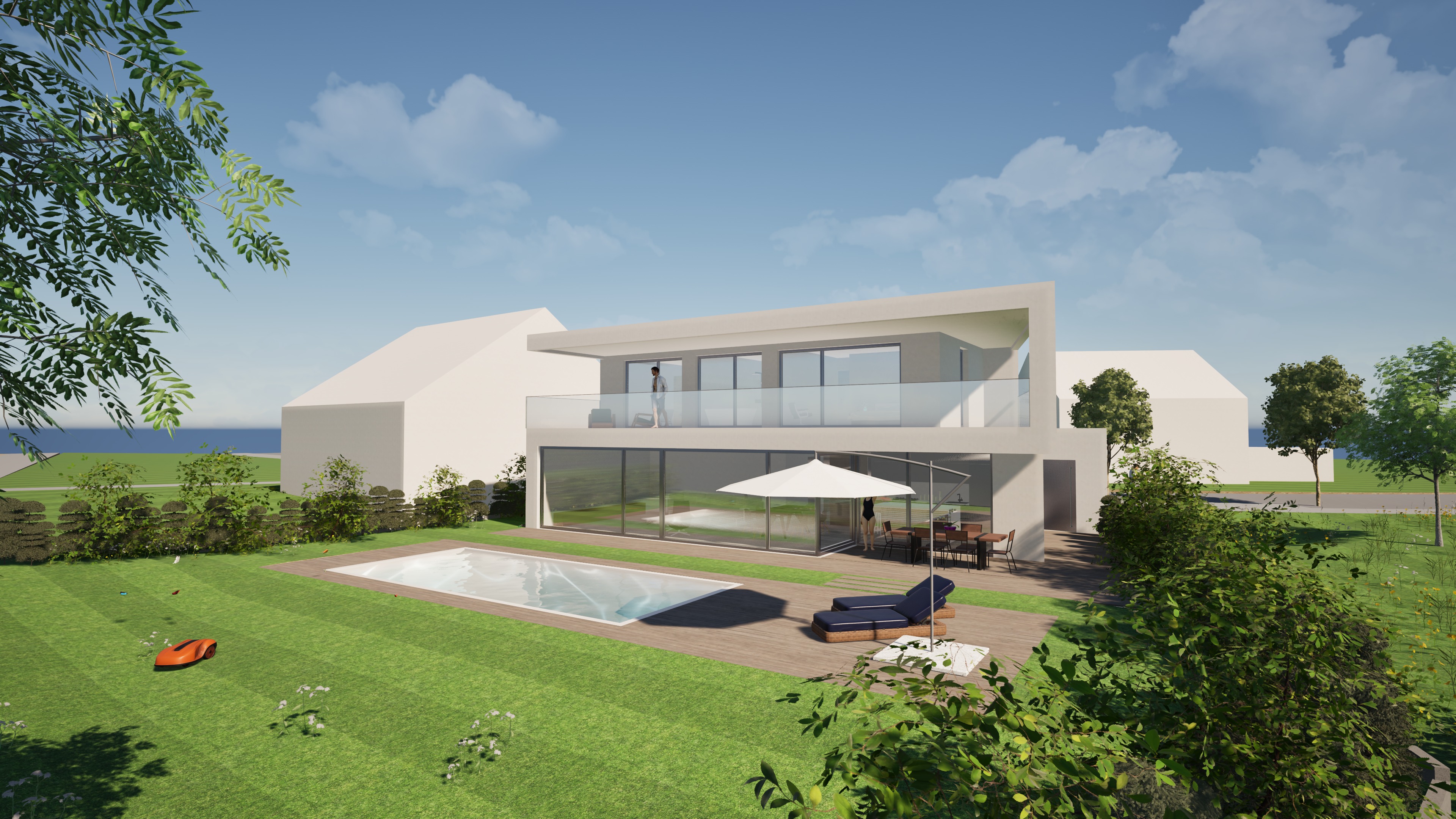 enhance the existing architectural rendering while strictly maintaining the original camera position perspective framing and composition do not alter the geometry proportions or design of the building create a calm high end photorealistic visualization that conveys a refined and professional atmosphere the image should feel natural balanced and realistic as if captured with professional architectural photography use soft natural daylight with realistic global illumination subtle shadows and accurate material reflections improve material quality with highly detailed physically accurate textures concrete glass metal wood etc ensuring correct roughness reflections and depth glass should have realistic transparency and subtle reflections surfaces should show slight natural imperfections to avoid a cgi look refine lighting and color grading to achieve a harmonious warm and inviting mood without becoming dramatic or over stylized avoid exaggerated contrast or artificial effects the atmosphere should feel calm and sophisticated enhance environmental details landscape sky vegetation people if present to support realism while keeping the focus on the architecture add subtle depth of field only if appropriate maintaining sharpness on the building the final result should look like a premium real estate marketing visualization elegant realistic and professionally presented
