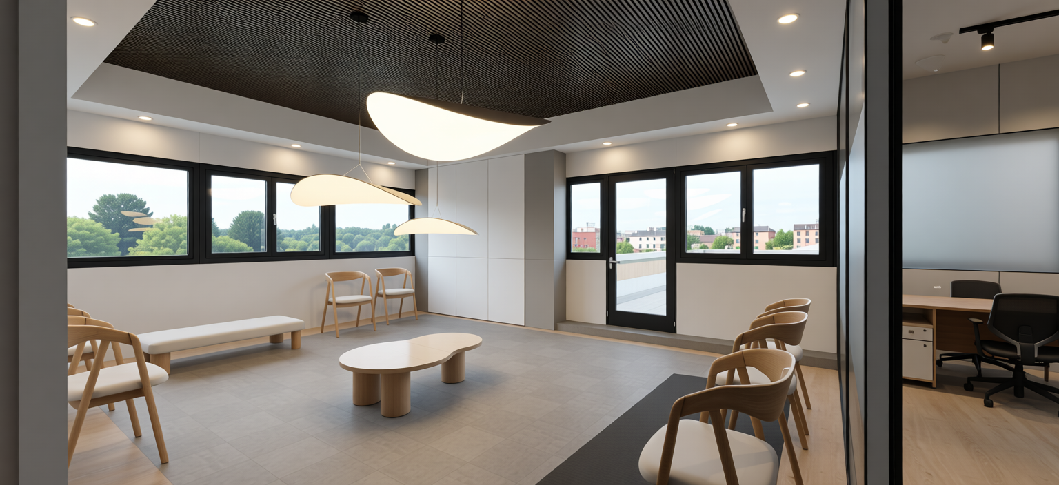 la suspension lumineuse est clair e on peut ajouter des quelques spots dans le couloir par les fen tres on a une vue sur de la v g tation et des petite immeubles les suspensions lumineuses sont clair es les montants des cloisons mobiles sont blanc respecter les cloisons vitr es avec stores et les cloisons pleines gris clair mat les assises des chaises sont blanches il n y a pas de stores aux fen tres ext rieures pas de spot sur le faux plafond bois la table basse centrale est blanche les murs sont gris la pi ce droite est un bureau de la m me profondeur que la salle d attente le faux plafond est en bois merci de respecter le mod le la porte est vitr e le sol est gris uni tr s clair