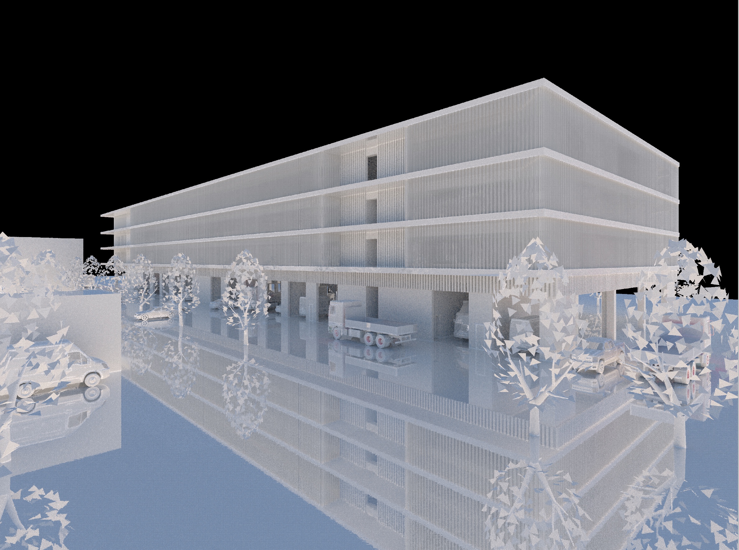 modernist exterior shot keep architectural and structural details no changes to the design facade in the upper floors made of white metal mesh yellow tow truck i n front of the building sectional doors in ground floor openings head of building to the left facade made of glass it is a snowy winter day architecture