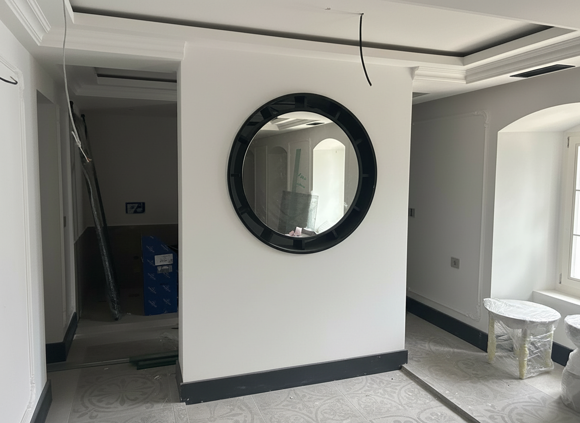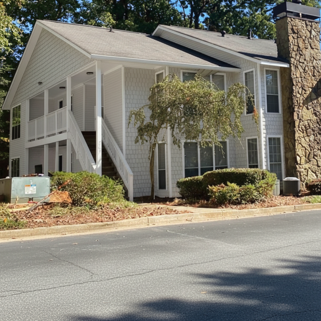 make as photorealistic as possible while keeping textures the same as selection professional landscaping in a lightly wooded scene with good lighting match materials to plan and remove any text light grey siding white trim windows black solid frontdoor