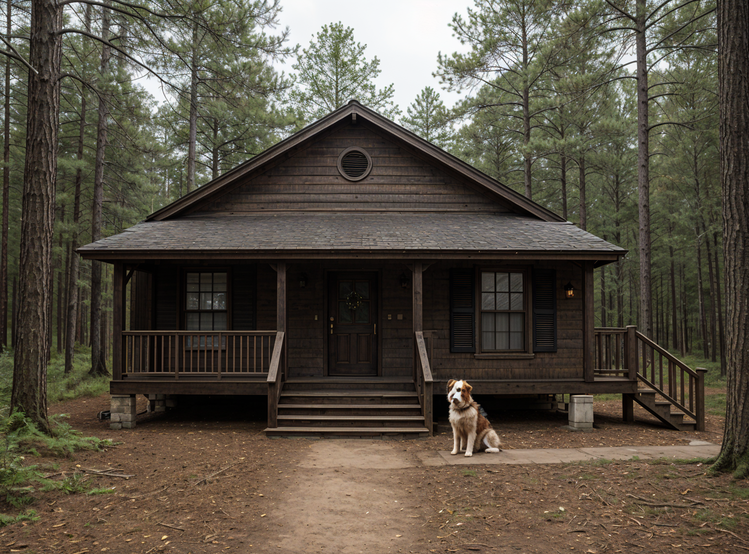 silver weathered cedar siding black shutters limestone pilings texas piney woods forest retriever