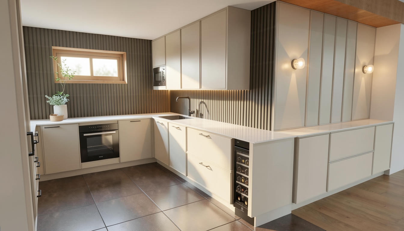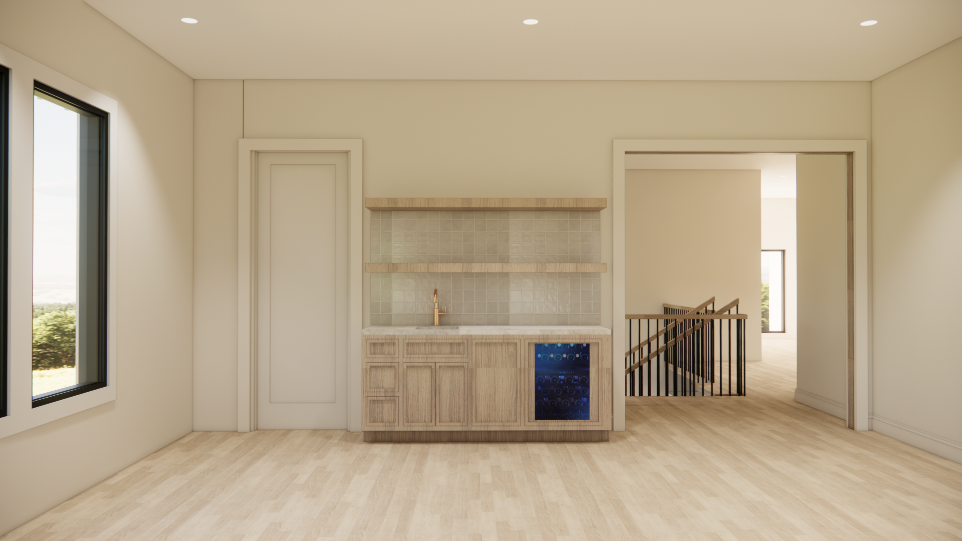 convert this architectural rendering into a highly realistic editorial style architectural photograph while maintaining the exact architecture layout cabinetry design materials colors and proportions shown in the rendering do not redesign restyle or modify anything no creative interpretation only enhance realism do not add any prompts text labels graphics or overlays to the image all materials colors finishes and selections must remain exactly as they appear in the rendering the flooring and cabinetry must remain the same material and tone as the kitchen images msi mccarran herringbone in ladson color maintain the exact color and pattern while enhancing realism through natural wood grain texture subtle tonal variation between planks and a soft matte finish the herringbone alignment should remain crisp and properly scaled countertops are honed taj mahal quartzite maintain the exact slab tone and veining while enhancing natural stone realism with subtle depth accurate thickness and soft honed surface reflection avoid glossy or exaggerated stone movement the backsplash is tilebar montauk gin white 4x4 mixed finish ceramic tile maintain the exact tile layout while enhancing realism through subtle handcrafted surface variation realistic grout joints and gentle light reflection consistent with mixed ceramic finishes lighting should resemble luxury editorial architectural photography soft natural daylight balanced interior exposure gentle shadows that add depth realistic reflections on stone tile and wood camera perspective should resemble professional real estate photography full frame camera perspective approximately 35mm lens straight vertical lines natural depth of field crisp material clarity do not add or remove furniture fixtures appliances decor or architectural elements the goal is strictly to enhance realism material texture and lighting while preserving the original design exactly overall result should feel like a high end luxury real estate photograph created from the original rendering