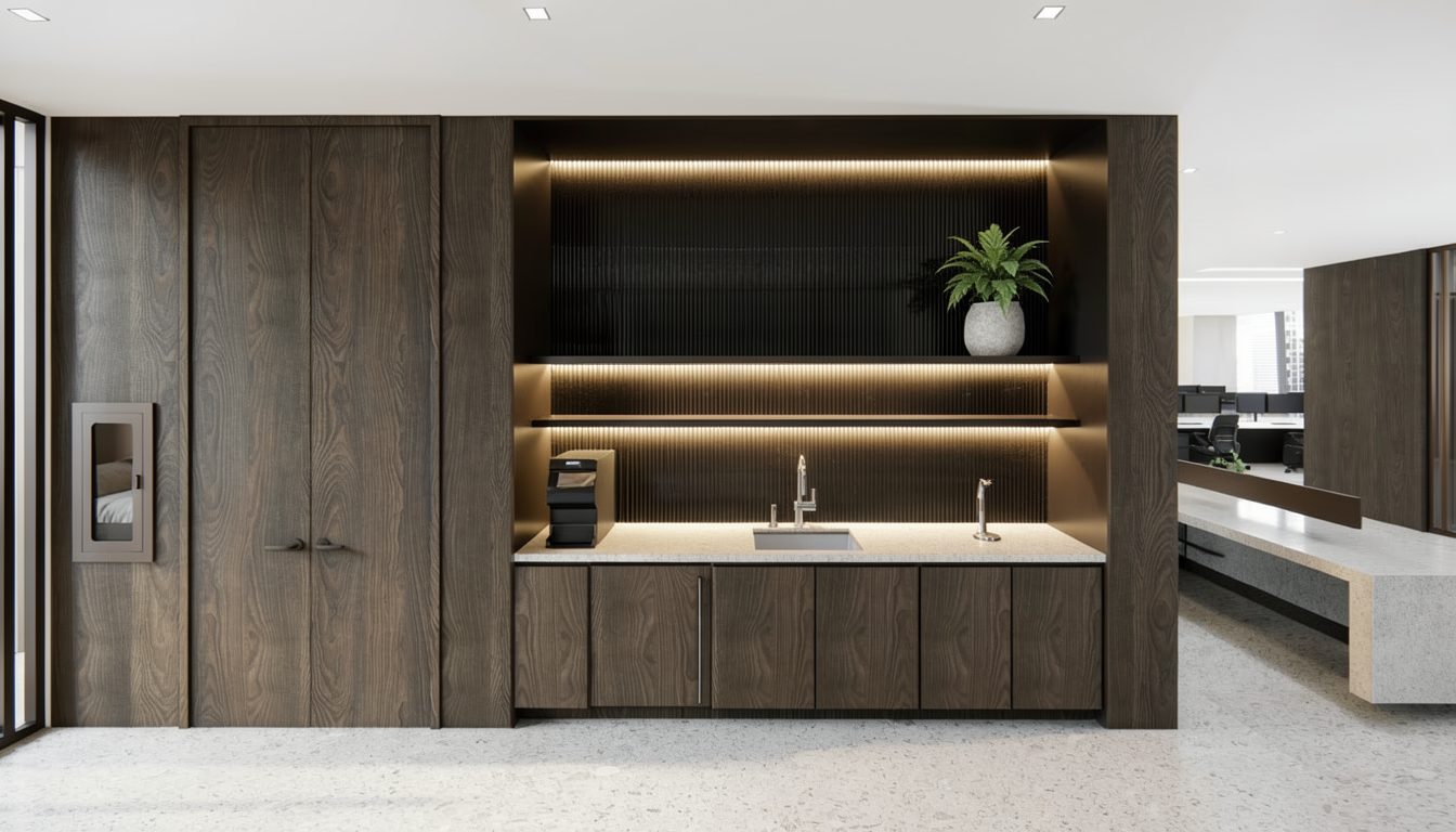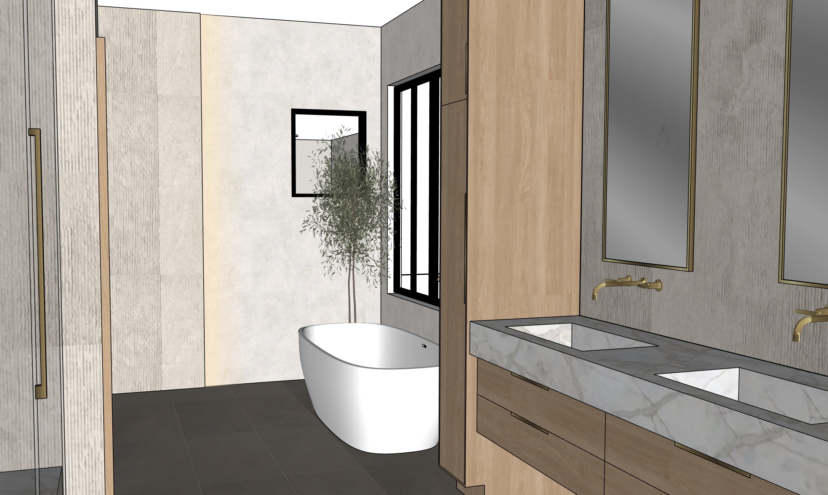 master bath with off white plaster walls lighter white oak wood flooring is a matte stone gray tan windows on 2nd floor with tree landscape see more plaster look on walls back wall vertical stone fluted tile with a soft linear light glow on plaster wall down light from ceiling on mirror wall vanity vanity wall has vertical stone behind mirrors vanity top is a marble