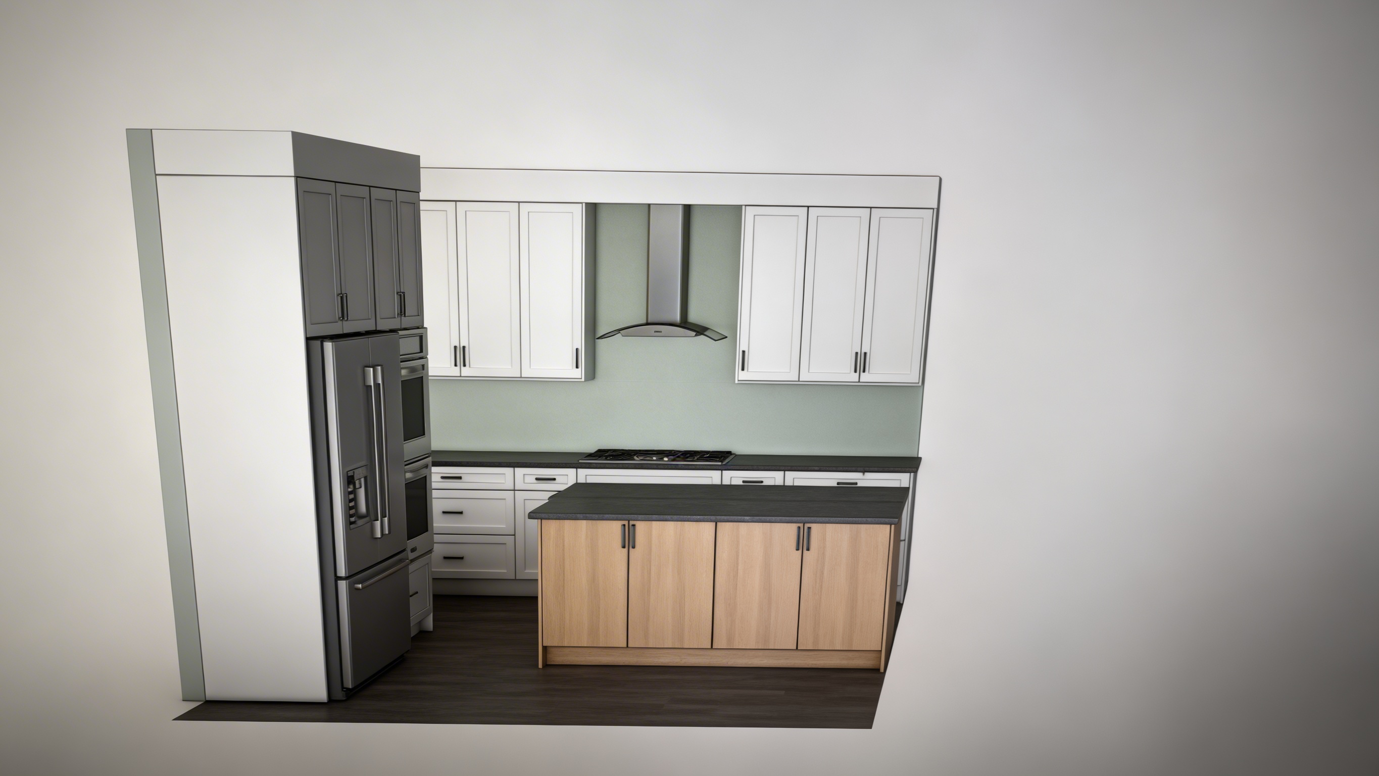 turn this model into a photo realistic image with olive green cabinets and white oak accents