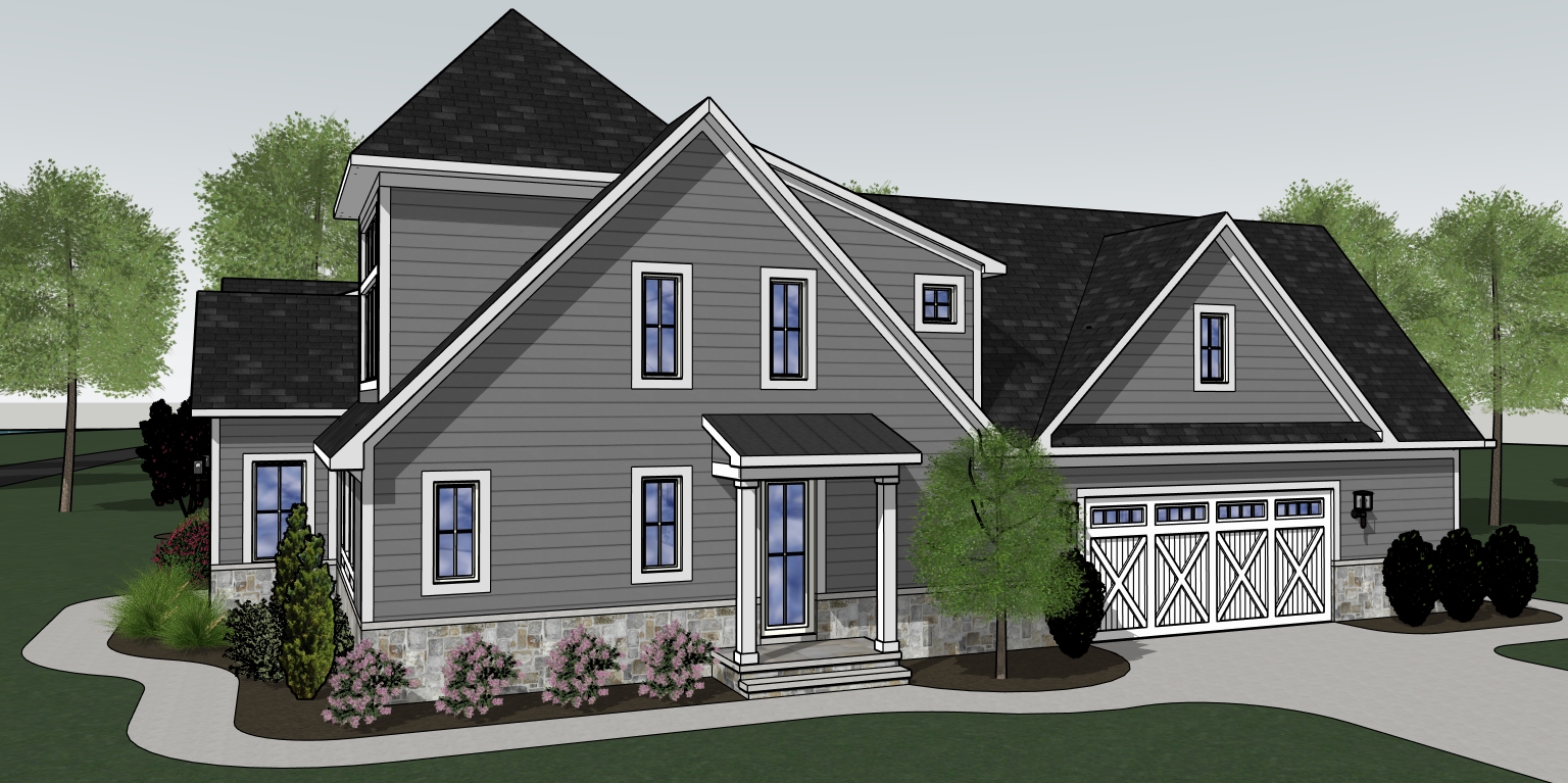 partly cloudy sky some deciduous trees in background add gutters white windows gray siding paved concrete driveway