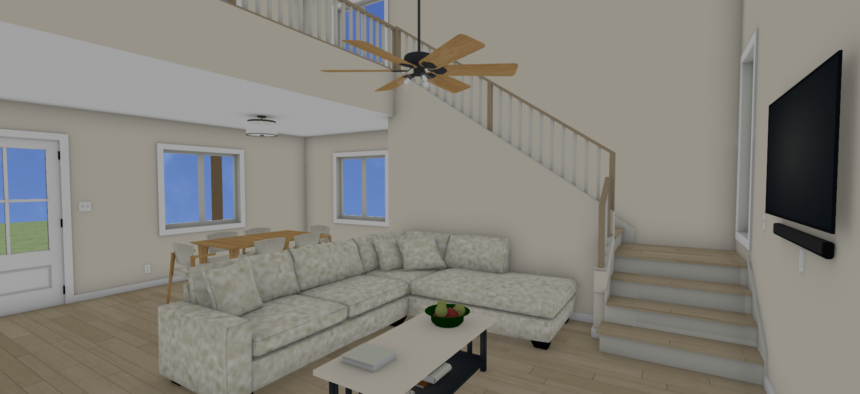 a high resolution ultra photo realistic rendering of a modern great room interior the space features light beige walls and warm wood plank flooring a sectional sofa with patterned cushions is arranged around a rectangular coffee table which holds a fruit bowl and books a flat screen tv with a soundbar is mounted on the wall opposite the sofa to the side a wooden staircase with white risers and railing leads upstairs with natural light streaming through nearby windows a dining area with a wooden table and chairs is visible in the background near two windows ceiling fixtures include a black ceiling fan with wooden blades above the living space and a modern round light in the dining area retain all architectural features furniture placement and room proportions while enhancing textures materials and lighting for photo realism