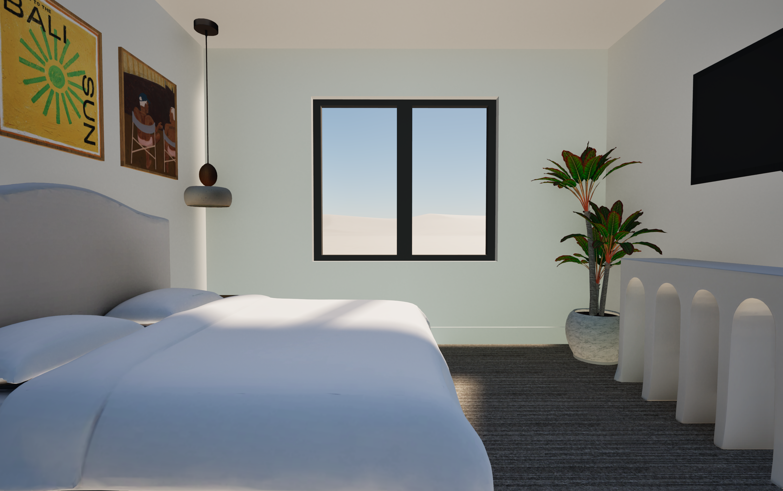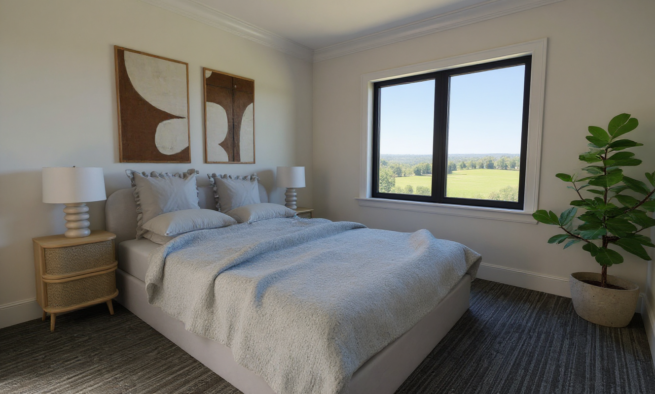 add subtle ceiling skirting cornices around the top of the walls but not the window and add a countryside view in the window