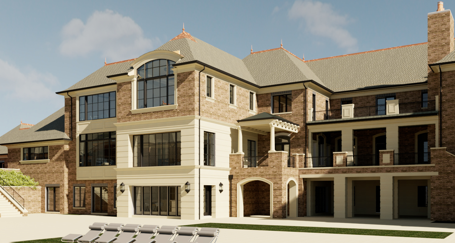 strict use the input image as the base maintain overall building geometry proportions rooflines and window door placements do not redesign the architecture composition create a zoomed in eye level perspective focused on the rear fa ade and pool deck crop tighter than the original image to emphasize the pool terrace and outdoor living space maintain a natural architectural camera no distortion or exaggerated wide angle critical pool hardscape keep the exact pool shape position and surrounding deck layout do not modify pool geometry coping lines or patio layout only enhance materials and realism texture lighting reflections project intent high end traditional luxury residence with a refined resort style backyard materials enhance realism do not change warm brick with natural color variation light limestone cast stone trim dark shingle or slate roof black aluminum windows and doors metal railings dark finish lighting warm golden hour sunlight soft shadows with depth under overhangs subtle interior glow for warmth landscape elevate to a clean high end residential landscape layered but restrained planting ornamental grasses low shrubs rich green lawn with realistic variation do not overcrowd or redesign layout outdoor living allow ai creativity here refined furniture layouts luxury outdoor seating loungers keep arrangements realistic and functional add subtle lifestyle elements pillows minimal decor detailing crisp edges realistic material transitions strong shadow depth at arches columns and trim physically accurate reflections in glass and water mood elegant calm upscale residential quality ultra photorealistic sharp high detail no people no text no signage