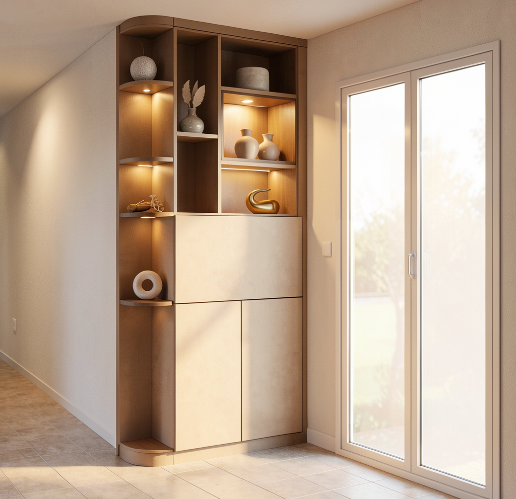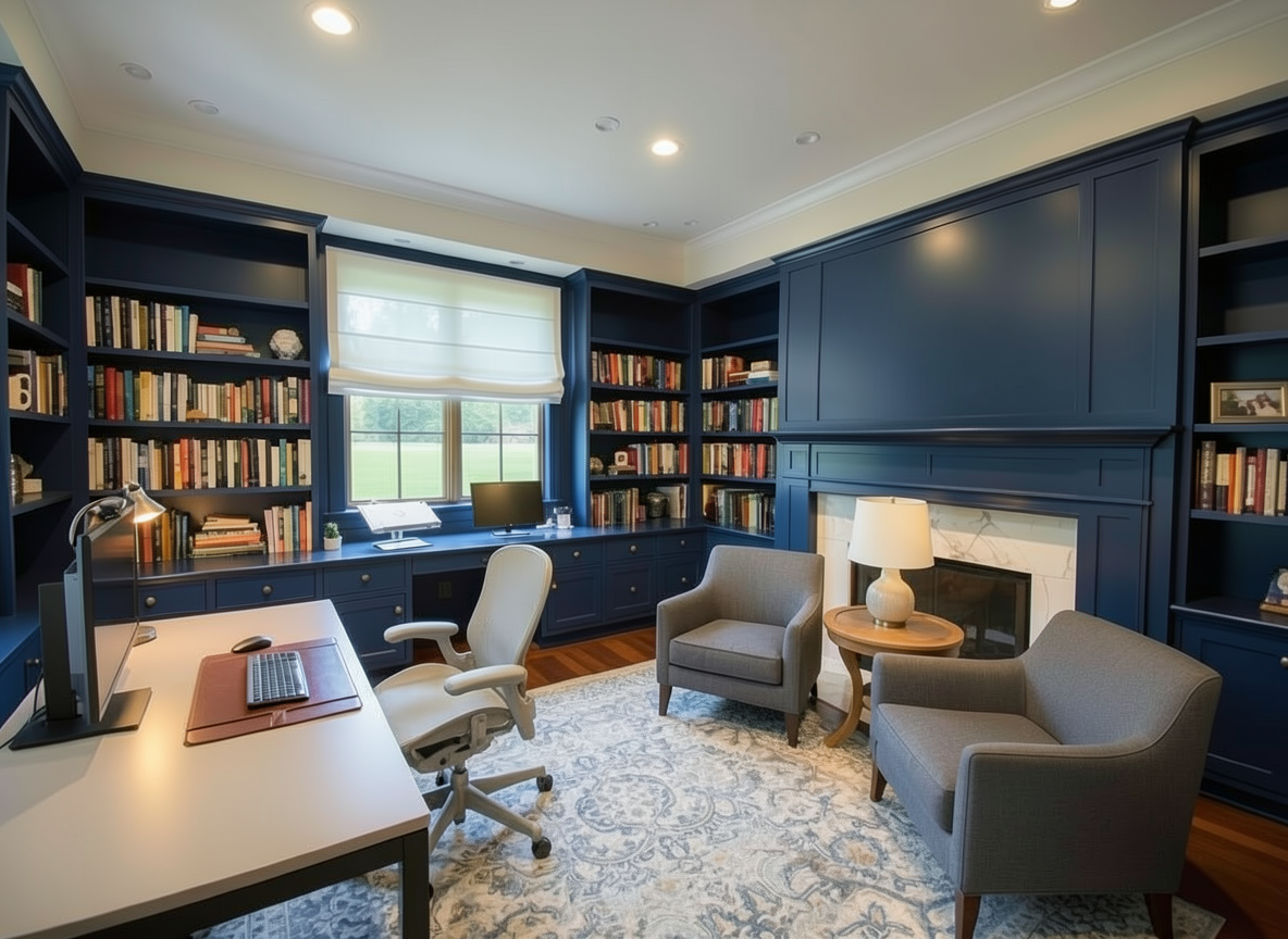 create a photorealistic rendering of this kitchen while preserving all existing materials colors and layout exactly as shown do not alter reinterpret or lighten darken any finishes the hood is a brushed copper metal with a soft natural patina maintain its exact tone and shape the island is a medium caramel wood tone with visible grain keep the warmth and depth consistent all perimeter cabinets are a deep black stained wood with visible wood grain the grain must clearly show through the finish not flat painted not opaque not matte solid black maintain the contrast between the dark perimeter cabinets and the warmer island tone lighting all sconces must have visible downward facing light downlighting casting a warm glow onto the backsplash lighting should feel realistic and slightly warm enhancing materials without changing their color additional instructions show all perimeter cabinetry clearly no cropping or shadow loss keep backsplash flooring and trim exactly as is maintain a real life high end natural lighting look not overly dramatic or stylized preserve cabinet hardware tones and placement the doorways on each side will lead to hallways keep the existing flooring color make the soffit beam the same color as the island