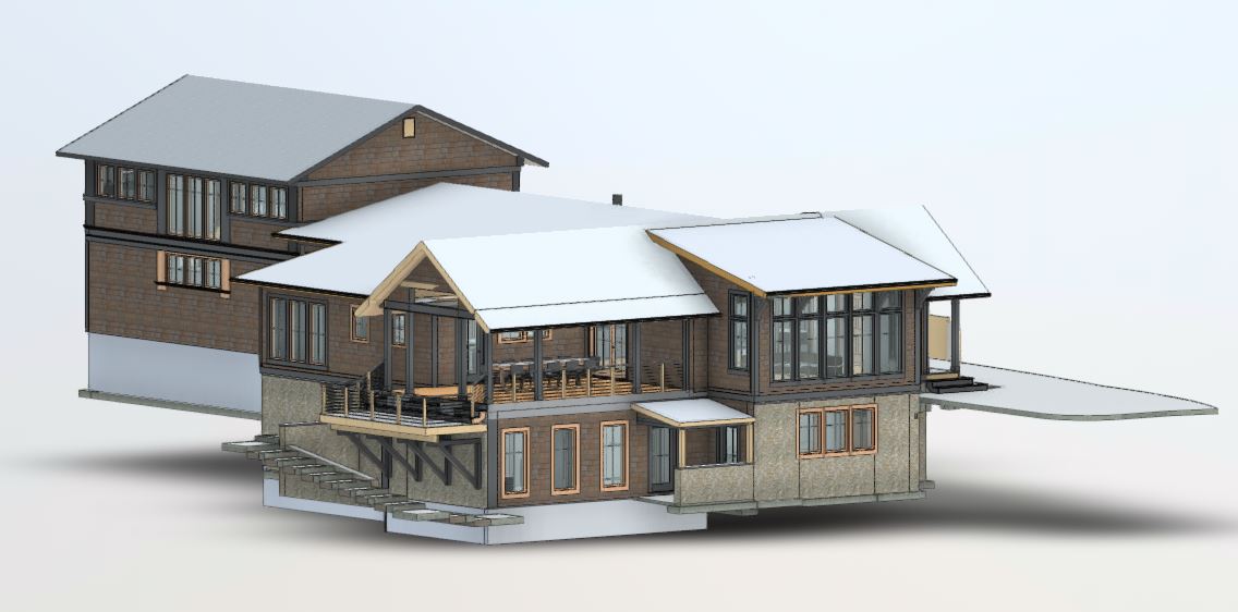 photorealistic architectural exterior render of the provided house design matching the exact massing rooflines window placement and proportions of the reference image exterior siding is natural cedar shake warm honey brown tone with subtle variation and realistic texture roof is standing seam metal matte charcoal gray with crisp vertical seams and accurate flashing at ridges and eaves all visible foundation retaining walls add terrace surfaces identify wall finished in blue stone with natural blue gray color variation and refined stone joints large divided light windows with dark bronze or black frames realistic glass reflections exposed timber porch posts and beams where shown natural wood finish elevated hillside site matching the reference perspective soft late afternoon lighting slightly warm sun angle realistic shadows high end residential architectural visualization ultra detailed materials realistic scale no people no text no distortion