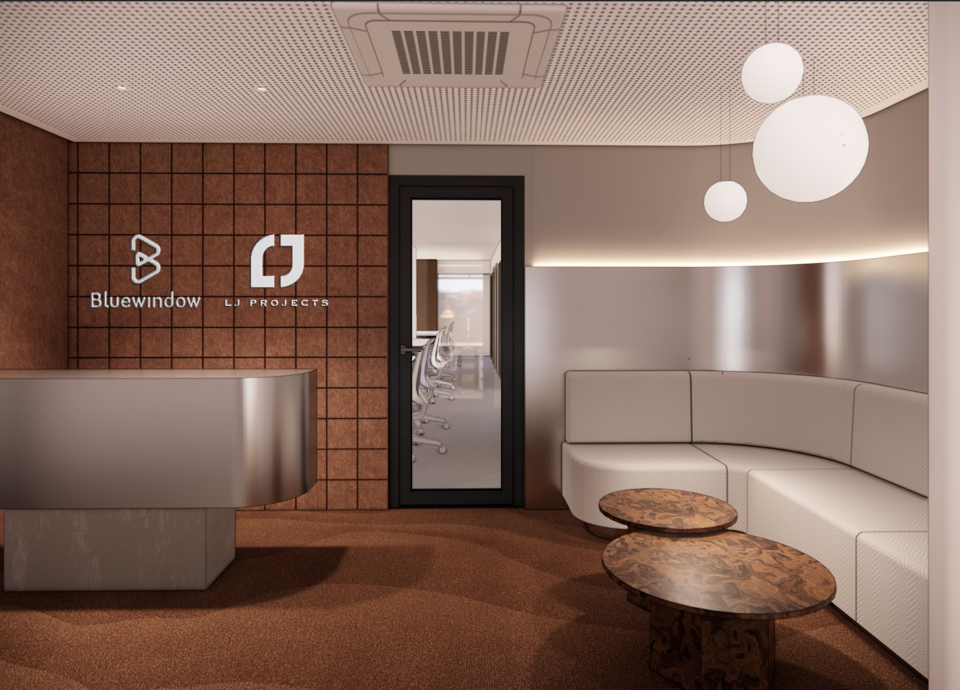 transform this interior render into a highly photorealistic image keep the exact geometry layout furniture lighting positions and proportions unchanged upgrade all materials with realistic textures and micro detail natural fabric texture on the curved seating realistic carpet fibers with depth variation authentic wood burl grain on the coffee tables brushed and slightly imperfect metal on the reception desk and wall panels and accurate perforated ceiling texture enhance lighting realism with soft global illumination realistic reflections subtle shadow gradients and balanced warm interior lighting increase depth contrast and material accuracy so the scene looks like a real professionally photographed interior not a cgi or sketch