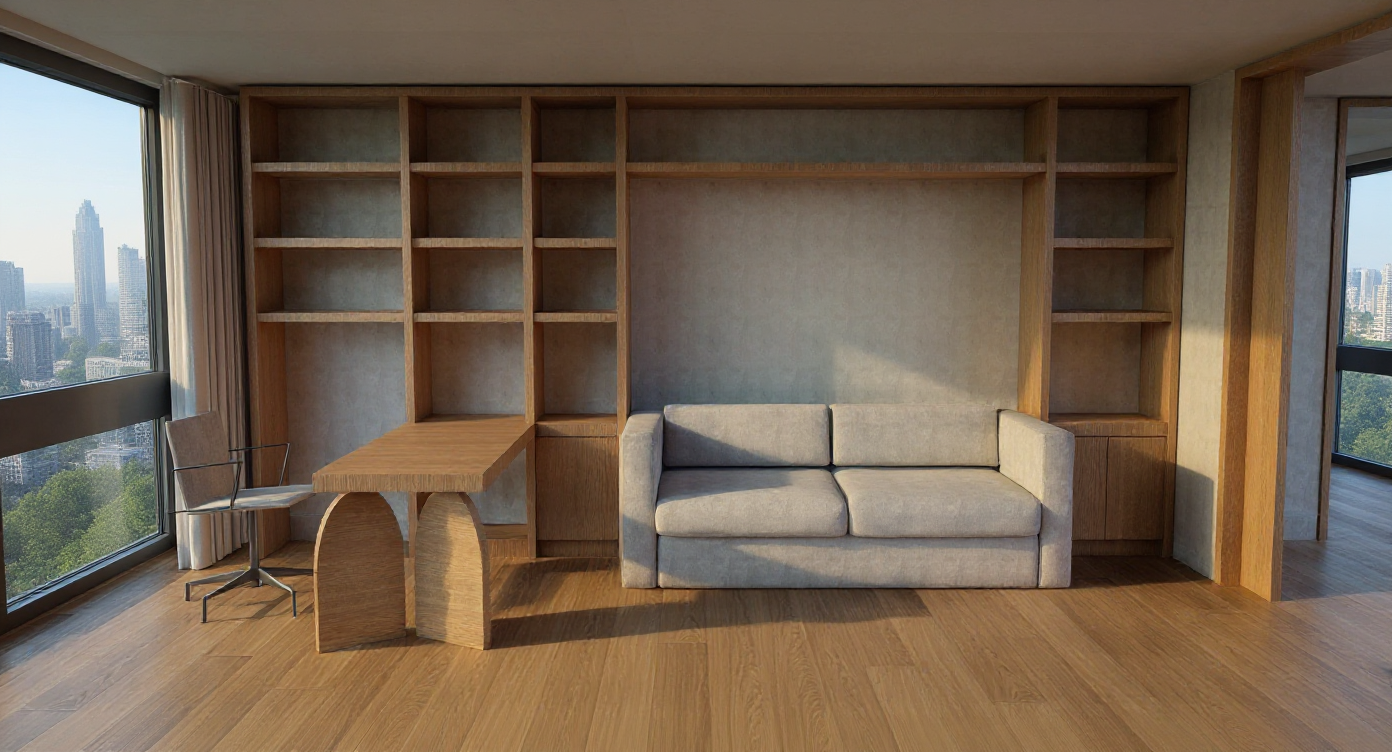 add a modern cozy living room background that complements the light solid wood sofa with grey cushions use soft neutral wall tones such as warm white beige or light grey paired with light wooden or matte flooring to create a clean and welcoming atmosphere allow gentle natural daylight from a nearby window to cast soft realistic shadows that highlight the wood texture and fabric details of the sofa position the sofa on the left side of the image occupying roughly one third 1 3 ratio of the frame while keeping the center and right side as open uncluttered space for visual balance place a few tasteful decorations beside the sofa for example a tall indoor plant in a ceramic pot a minimalist floor lamp or a small side table with a vase or d cor piece to enhance the composition and add visual warmth you may also include subtle wall d cor such as framed artwork to complete the scene do not alter the design color or angle of the sofa itself maintain realistic lighting proportions and shadow consistency