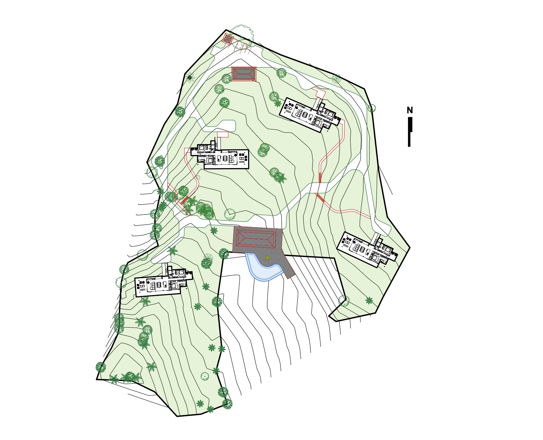 aerial shot this is four buildings with a comunal swimming pool on a hillside