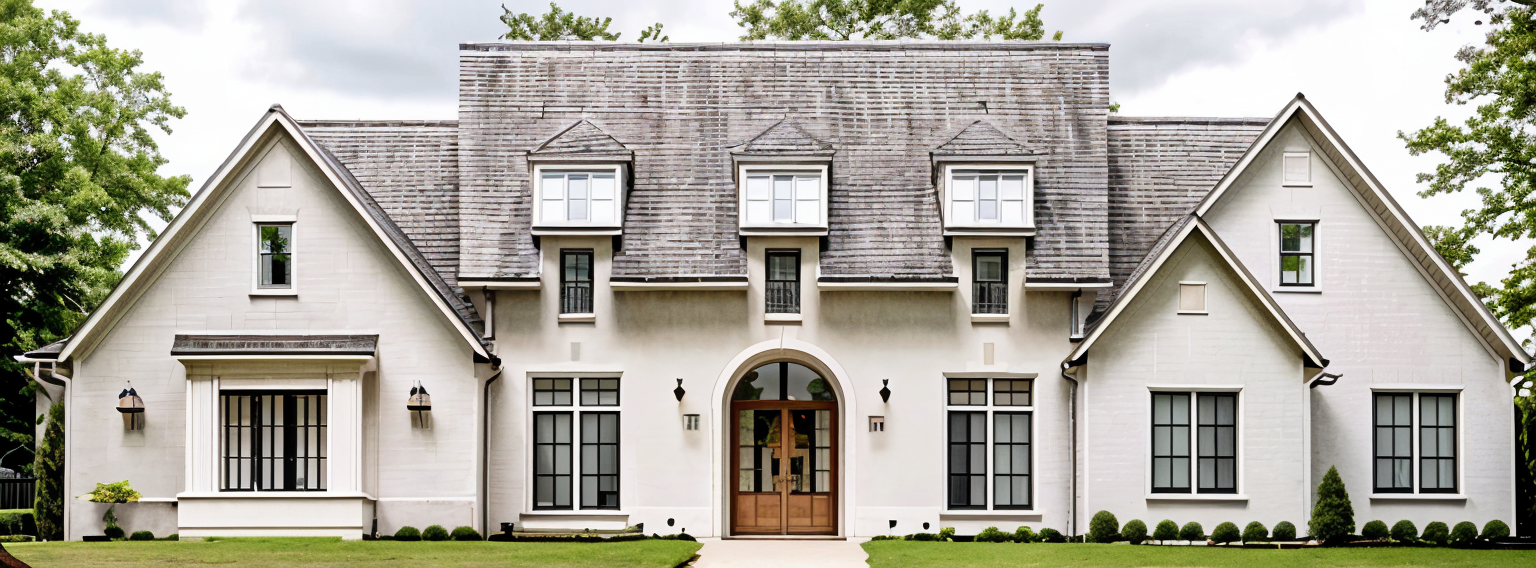exterior shot stucco and stone details with window shutters and a french double door
