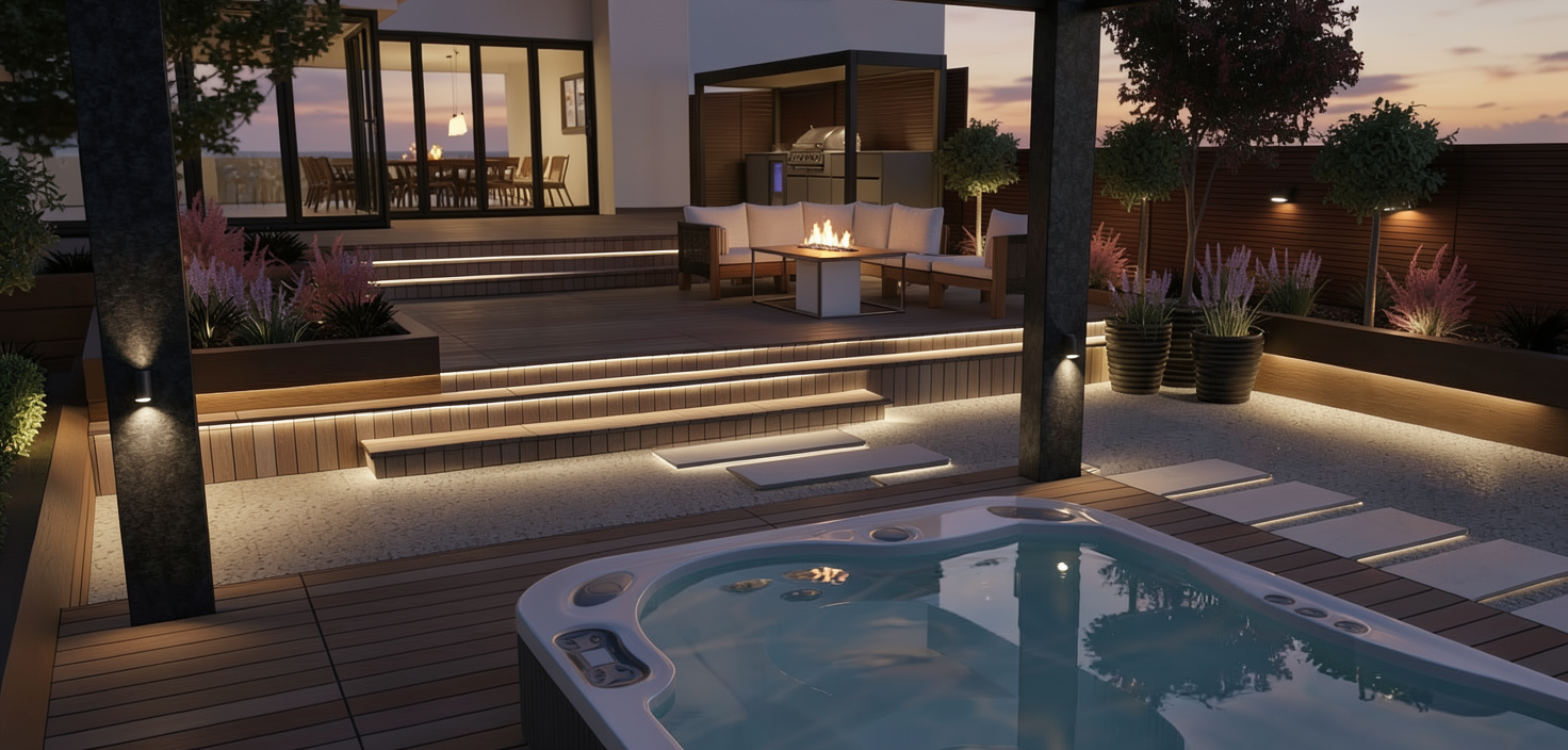 provide photo relaistic landscape render sunny afternoon with some shadowing show kitchen diner behind the windows in the distnace someone standing at the bbq in the distance and a group of friends sitting on the sofa around the firepit table