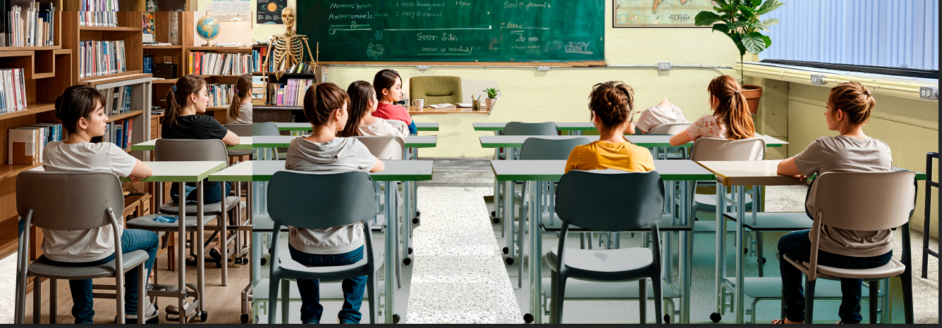 put boys and girls ten years old students sitting on gray plastic chairs facing backwards the surface of the tables is white with an olive green edge