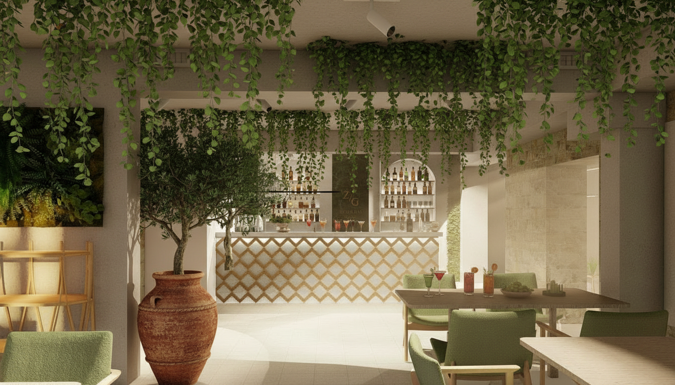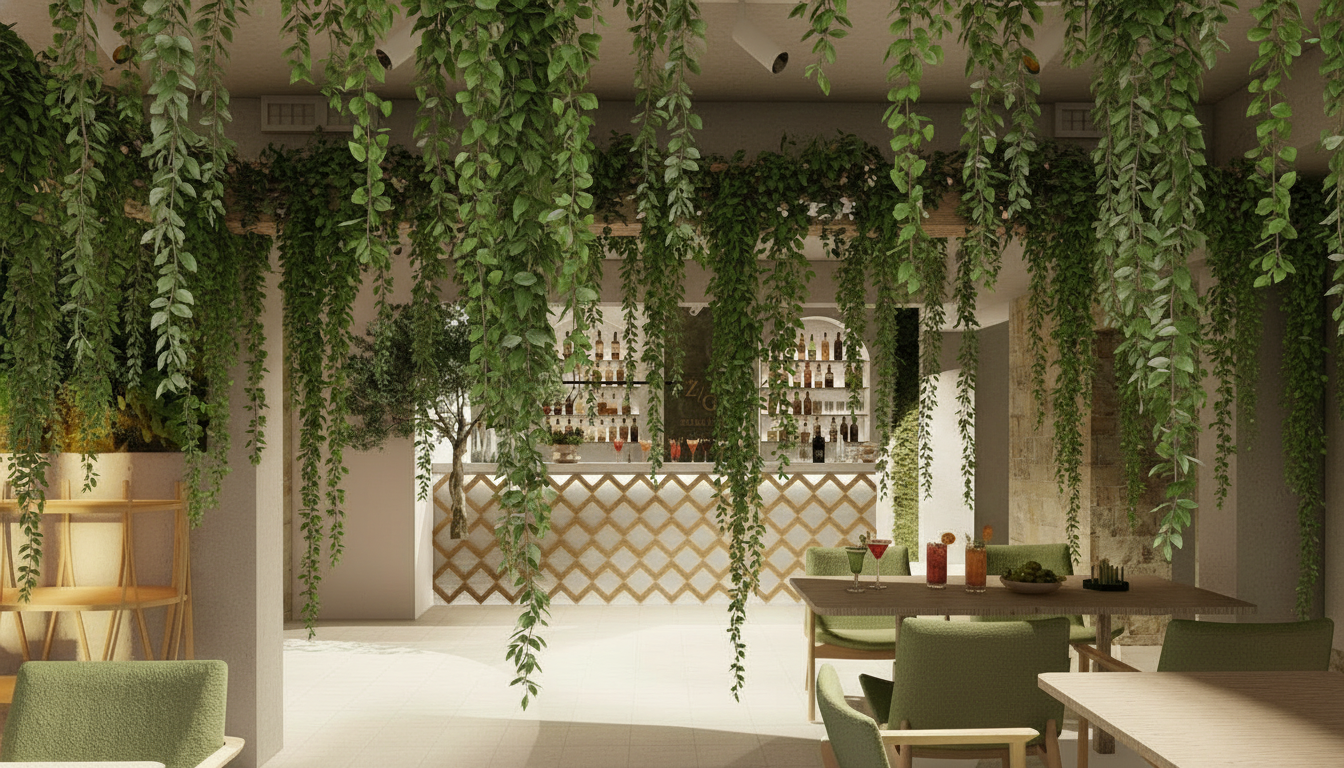 keep everything in the scene exactly the same geometry layout materials and camera angle only add hanging plants falling softly from the ceiling and improve the overall lighting to look more natural and warm do not change or move anything else and do not reduce image quality just make the lighting and plants look realistic and beautiful architecture
