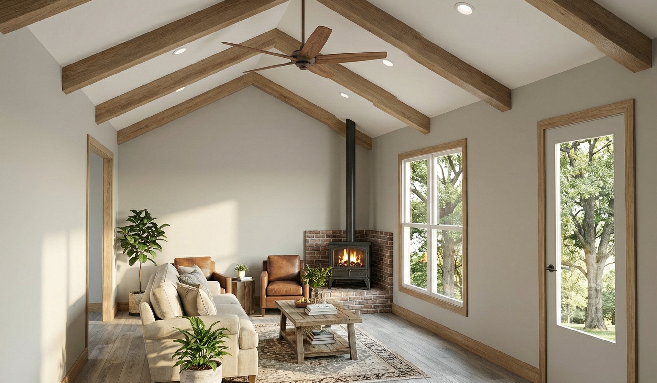 only change door to a wood door and change window from white to black delete wood stove pipe and put wood mantle above it