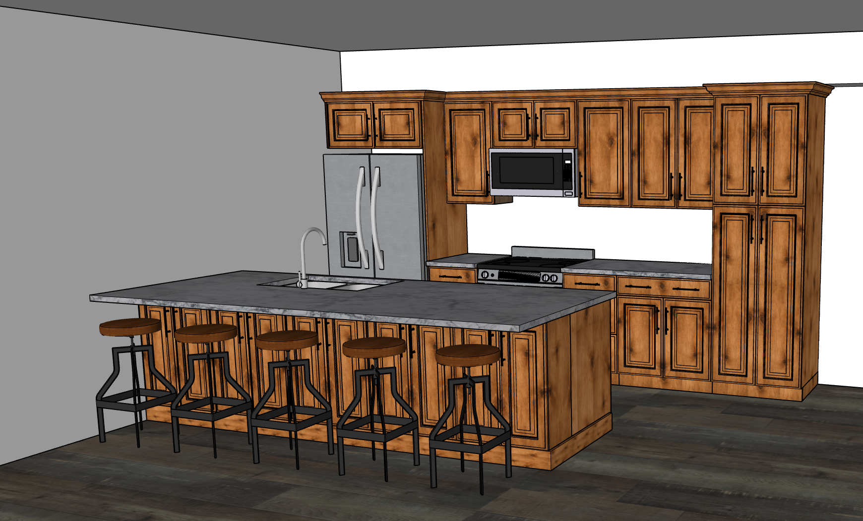 this is a beautiful kitchen with cabinets made of knotty walnut stained with a whitewash stain and a toffee glaze the handles are all a matt black all appliances are a modern stainless steel the countertops are a beautiful white marble the flooring is a nice modern medium light rustic lvp flooring this kitchen has lots of natural light coming in from behind the camera the cabinets go up to a soffit in the ceiling that drops down about 14in and extends off the wall about 15in