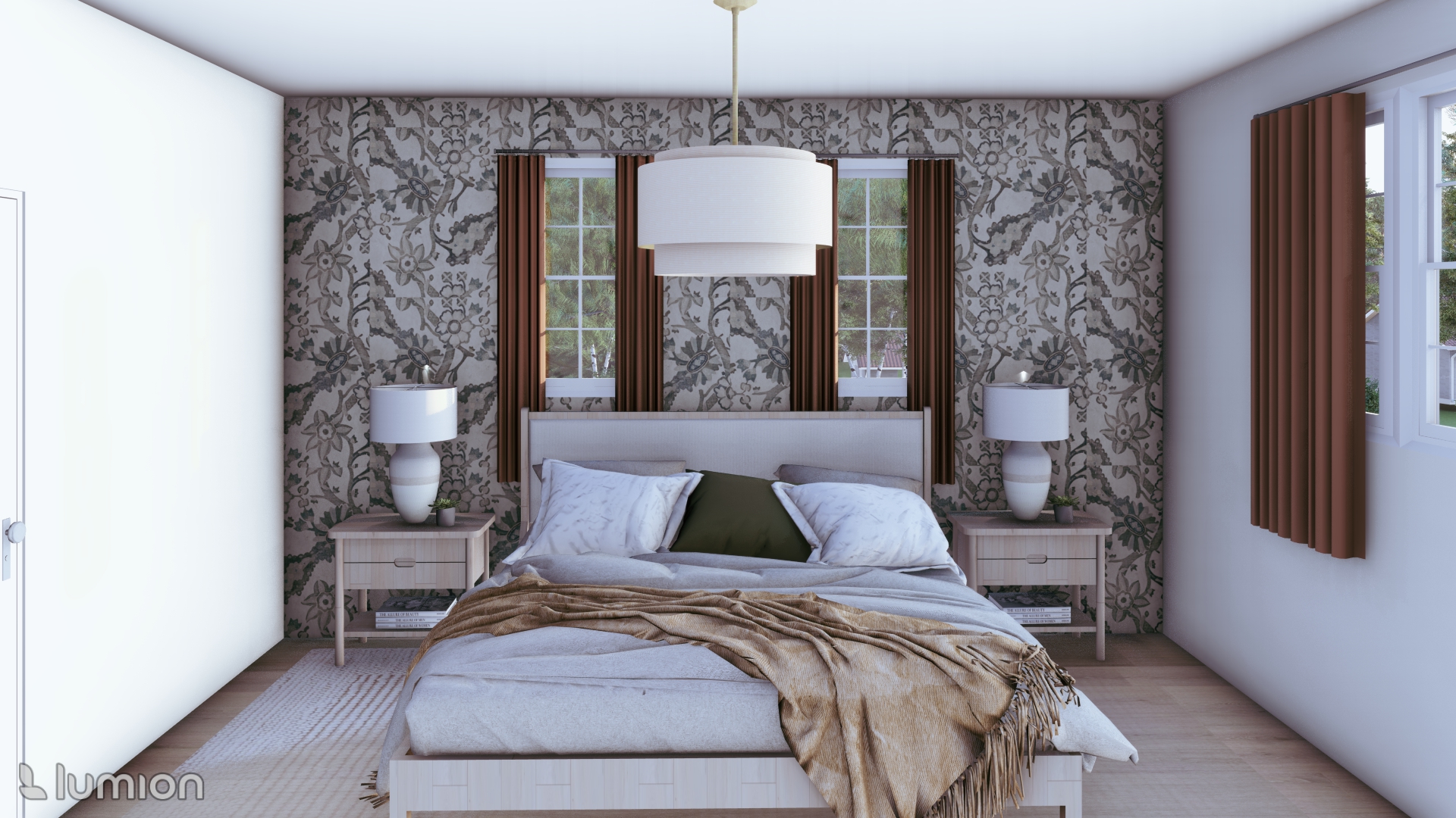 this is an already rendered picture of a family home add realistic textures to the surfaces without changing the colors or anything else add soft warm light coming from the ceiling light and the two lamps on the nightstands add a suburban neighborhood through the windows with soft sunlight coming in without being too harsh
