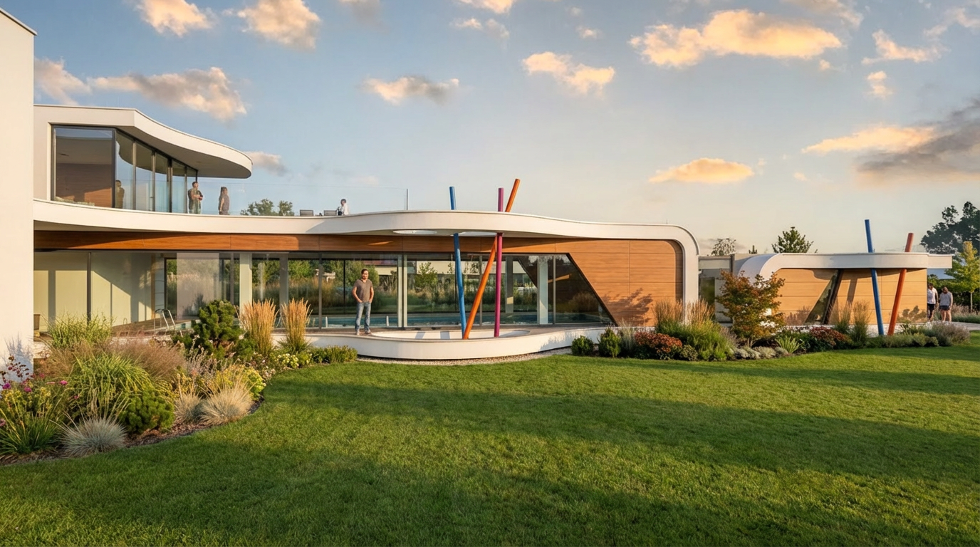 place this house in a green settlement without hills and the focus should be on this house