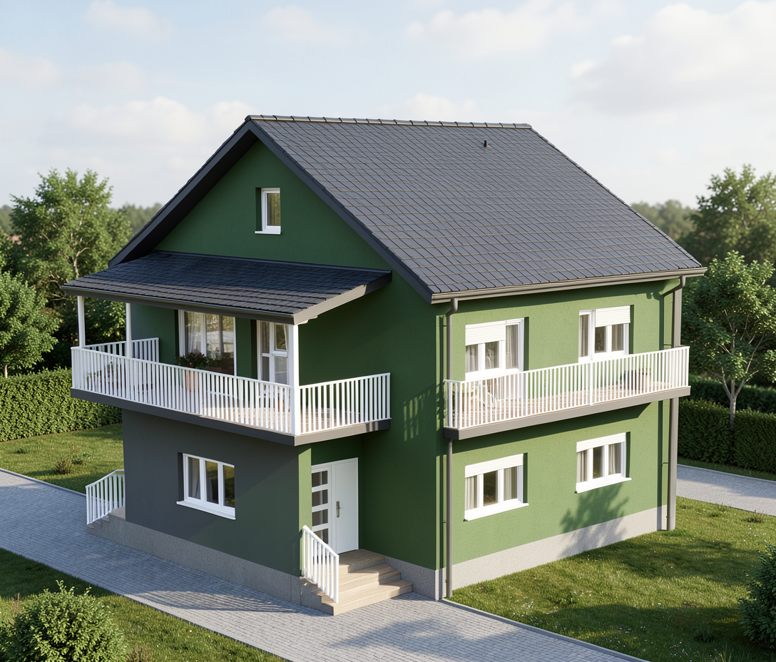 photorealistic architectural render of an existing two story family house preserving the original building shape roof geometry balconies window placement and proportions exactly as in the reference model updated modern exterior design with a warm light beige main facade complemented by a darker taupe accent on the recessed sections of the house anthracite roof tiles white window and door frames and white wooden railings on the balconies and exterior stairs clean timeless european residential architecture high quality materials realistic textures natural daylight soft shadows neutral surroundings ultra detailed and realistic proportions