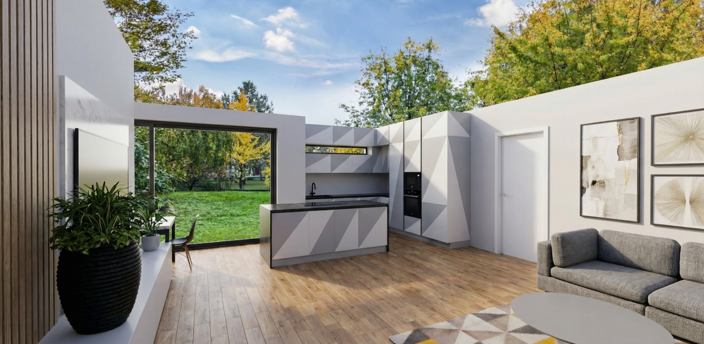render fotorealistico cucina con anta legno massello bianca senza maniglia zoccolo e gola bronzo illuminazione naturale piano di lavoro con venatura delicata pavimento travertino chiaro illuminazione naturale atmosfera accogliente ed elegante come oggettistica inserisci una macchinetta del caff della espresso con due tazzine vicino al lavello un vaso trasparente con dei fiori delicati sul piano di lavoro di fronte l isola e alcuni oggetti da cucina