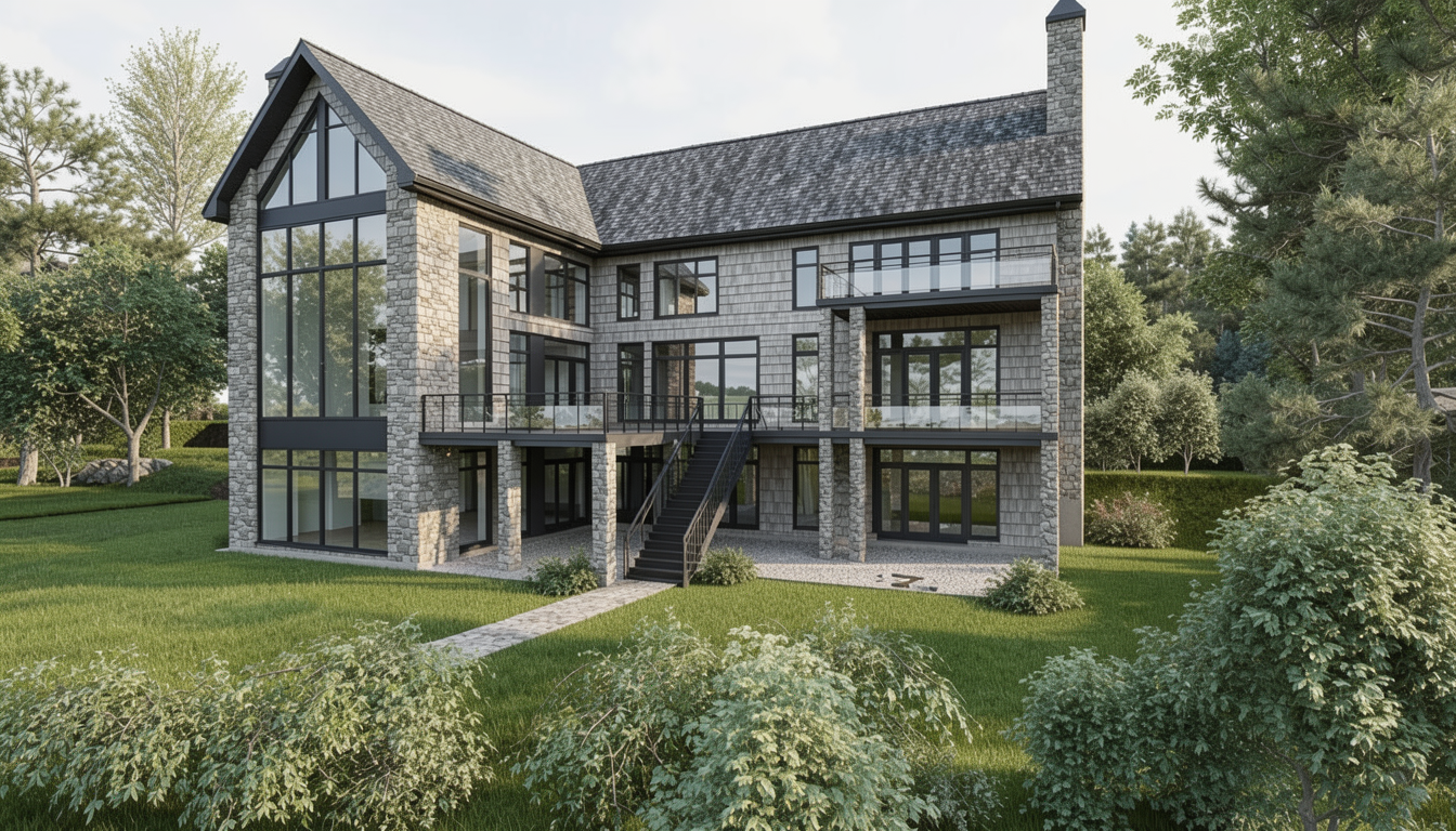 the wood should be cedar shingle style in a soft grey light natural tone maintain stone columns at entry charcoal grey trim inside windows keep window frames and sill in warm white to match siding all doors in dark charcoal grey with modern profiles keep all architecture window sizes and proportions exactly the same do not modify any other materials or areas of the house keep the design clean minimal and in a refined studio mcgee style no changes to architecture enhance details for presentation