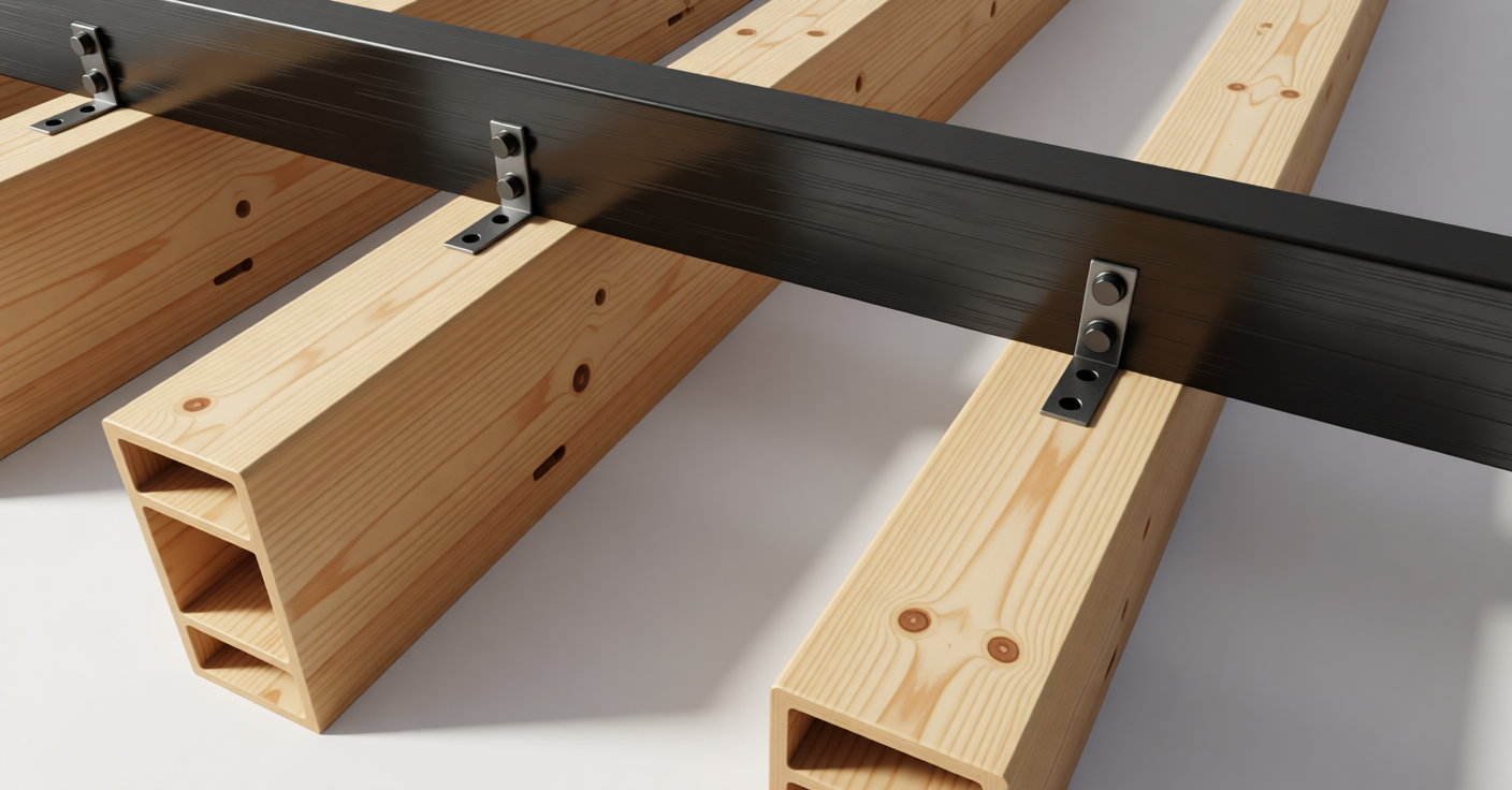 make it more realistic maintain the holes maintain the finish of the new metal joist maintain the colors maintain the finish of the beams that are made of wpc
