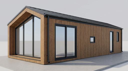generate a realistic corner perspective 3 4 view of a single family house based strictly on the provided orthographic side elevations preserve the exact massing proportions and roof geometry a low pitch gable roof with dark trim on the main facade include large on the adjacent side facade include smaller vertical rectangular windows matching the positions from the elevations camera at eye level 35 45 mm focal length natural daylight soft shadows neutral plain background semi realistic architectural visualization style clean and minimal scene no environment elements dodatkowo wypu przednie ciany by frontowe okno by o troche cofniete oko o 40 cm chcia bym zrobi wizualnie wykusz dodaj rynny
