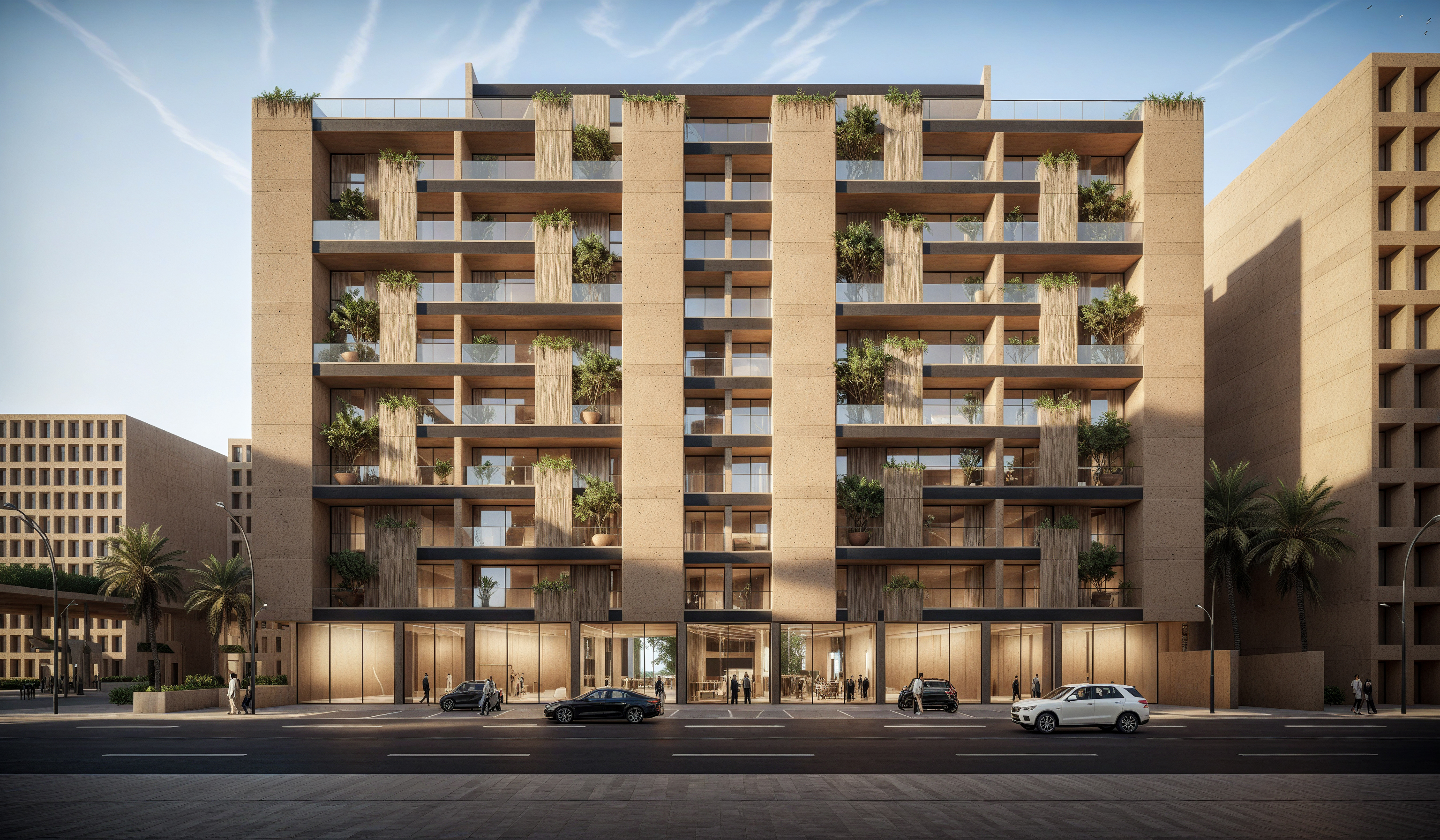 hyperrealistic architectural photography 8k resolution global illumination raytracing ambient occlusion sharp focus cinematic lighting volumetric atmosphere uncompressed raw photo enhace vegetation cars and people as if it was located in ryhad do not change the architectural design materials or geometry of the building just enhace reflections of the materials