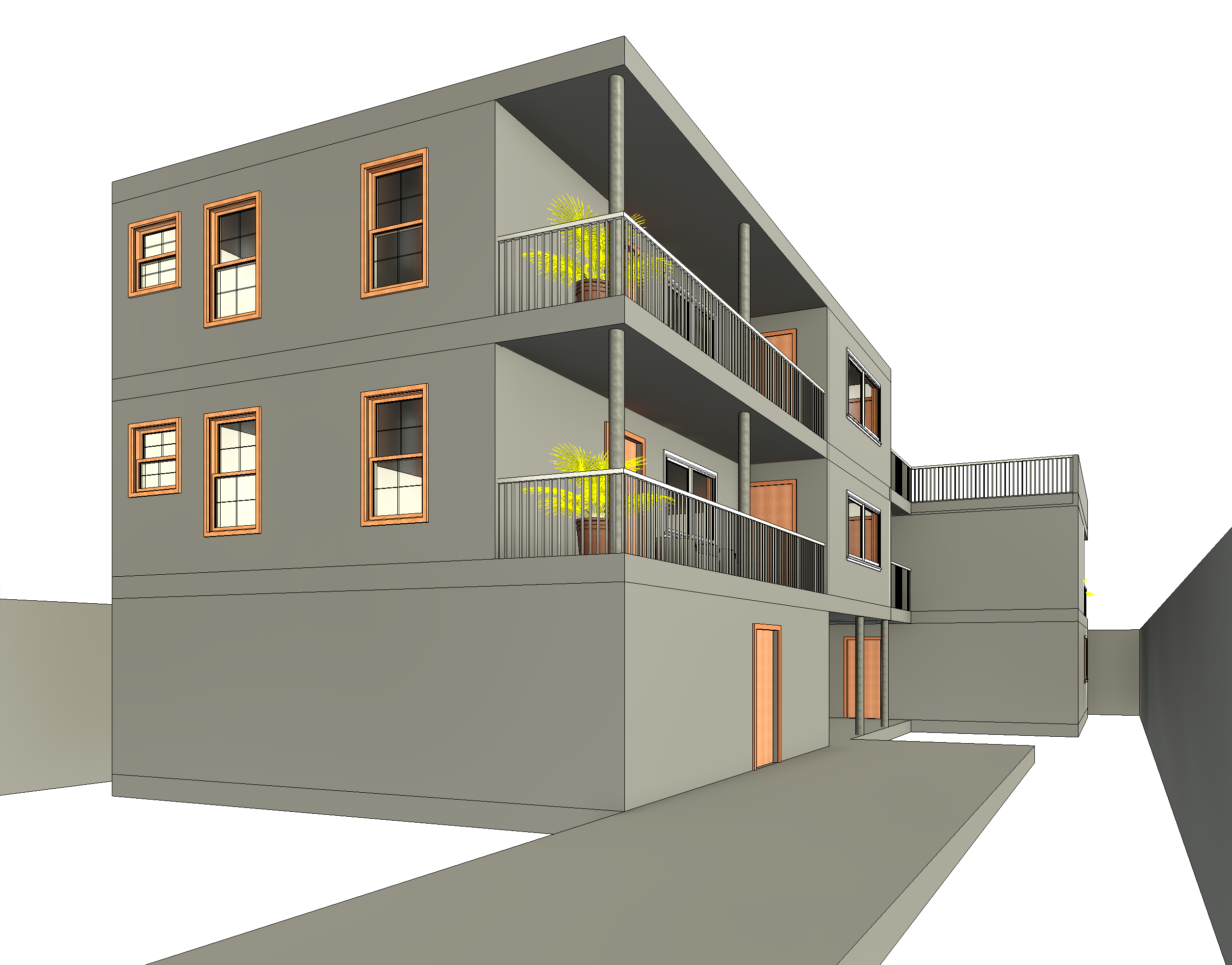 new building in a residential california neighbourgh with plants we re is white foreground is grass with plants polished concrete build is beige warm tones at gonden hour with soft shadows