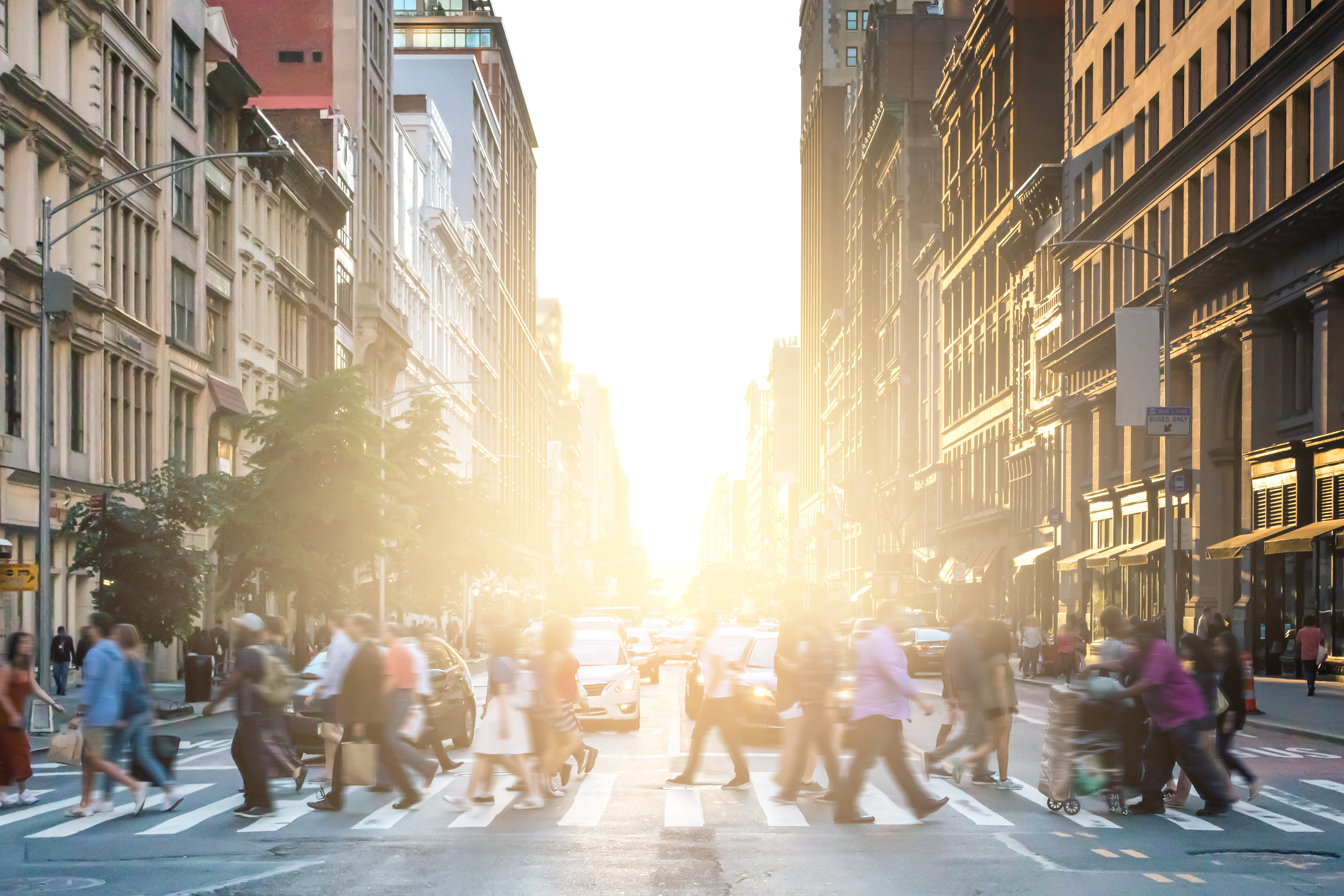 make this image into a new yorker style black and white sketch show the hustle and fast pace of city life
