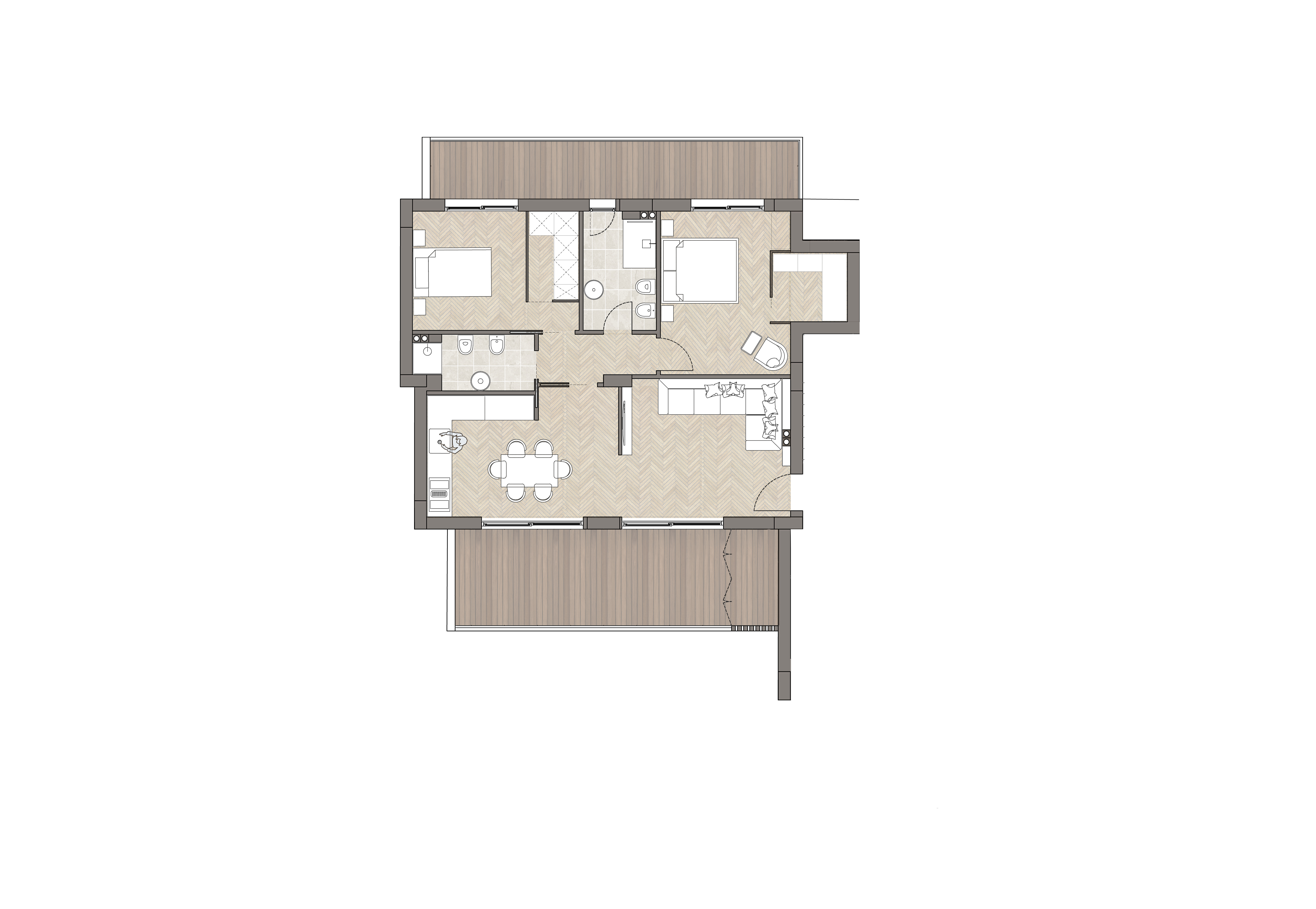 convert this floor plan into a realistic isometric 3d view of a full house show the space from an elevated angle with furniture walls and details visible genera render iper realistico stile neoclassico contemporaneo use the same furniture as shows on the plan do not change the orientation of the floorplan
